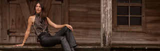 Woman wearing a white short-sleeve top tucked into high-waisted blue leather pants, accessorized with the Bettie Belt in Mocha—featuring a gold-toned buckle—and styled with gold bangles and a gold ring.