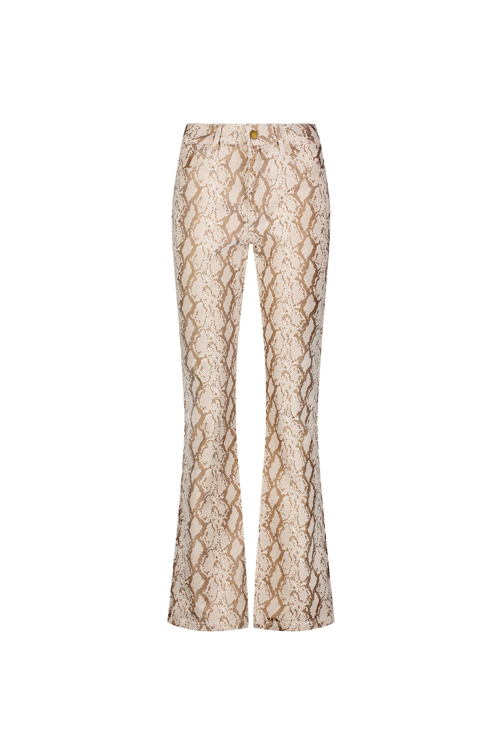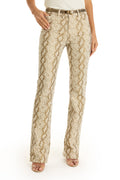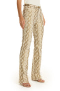 Made for compliments - meet the Aria Python Jean. Designed with a sleek, slim bootcut and fitted through the hips and knee and flared at the hem, this alluring style makes a statement with it's allover semi-shine snake foil. Featuring a mid-rise fit and tailored to pair with heels or flats, this piece is perfect from day to night.