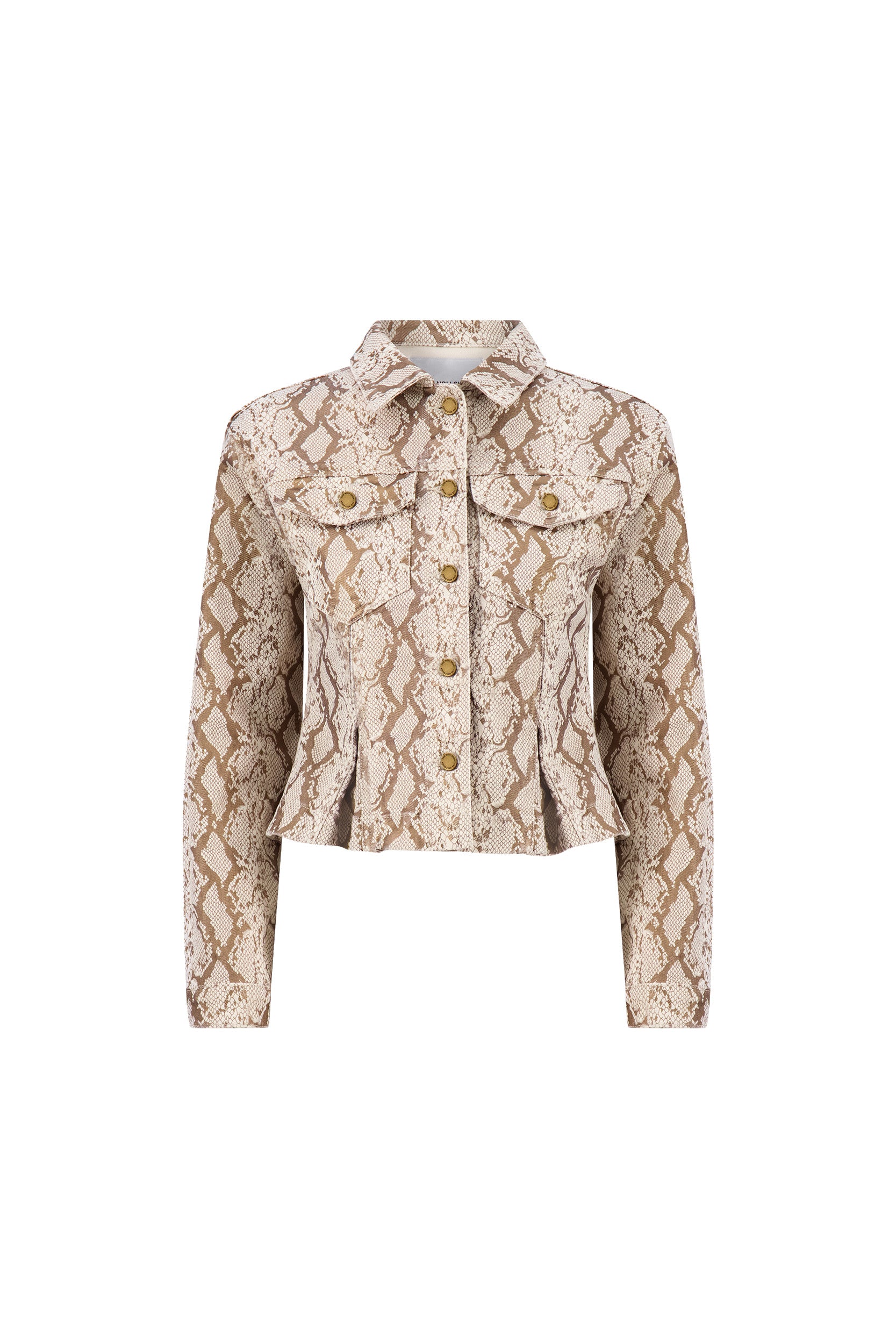 Introducing the Bethanie Denim Jacket, where timeless tailoring meets contemporary edge. This sophisticated piece showcases a stunning metallic snake print paired with lustrous gold buttons that catch the light beautifully. The point collar and long sleeves deliver polished structure, while dual chest pockets blend practicality with style. A pleated peplum hem adds unexpected dimension to the classic fit, creating a jacket that commands attention whether dressed up or down.
