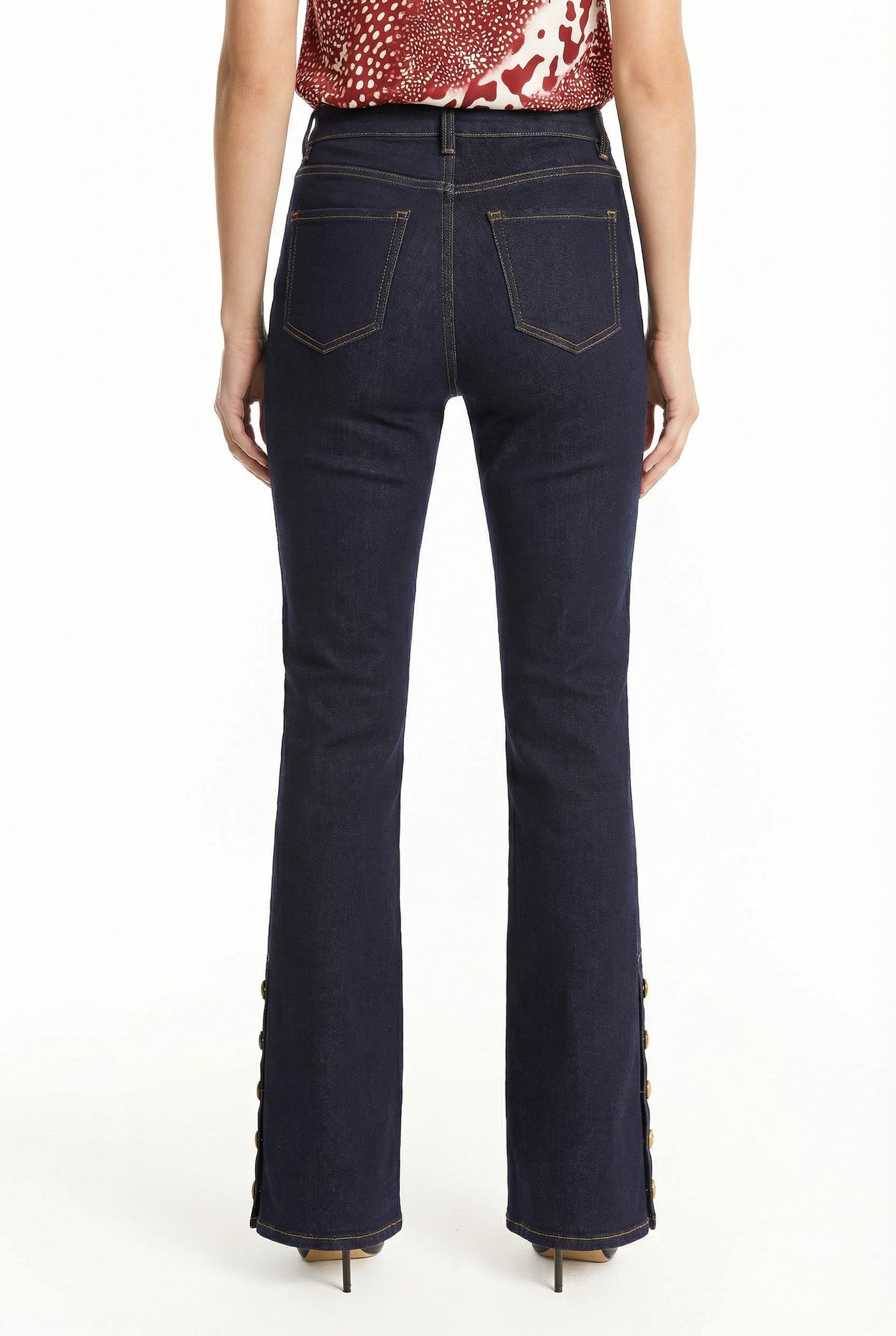The Veronica Button Jean turns heads everywhere you go. Crafted from signature four-way stretch denim, these mid-rise flares feature a flattering leg-elongating silhouette enhanced by contrast stitching along the front seam. A distinctive side fashion button detail adds elegance and luxury to this wardrobe essential. Designed to move with you while maintaining its shape, this denim pairs perfectly with your favorite blouse or blazer.