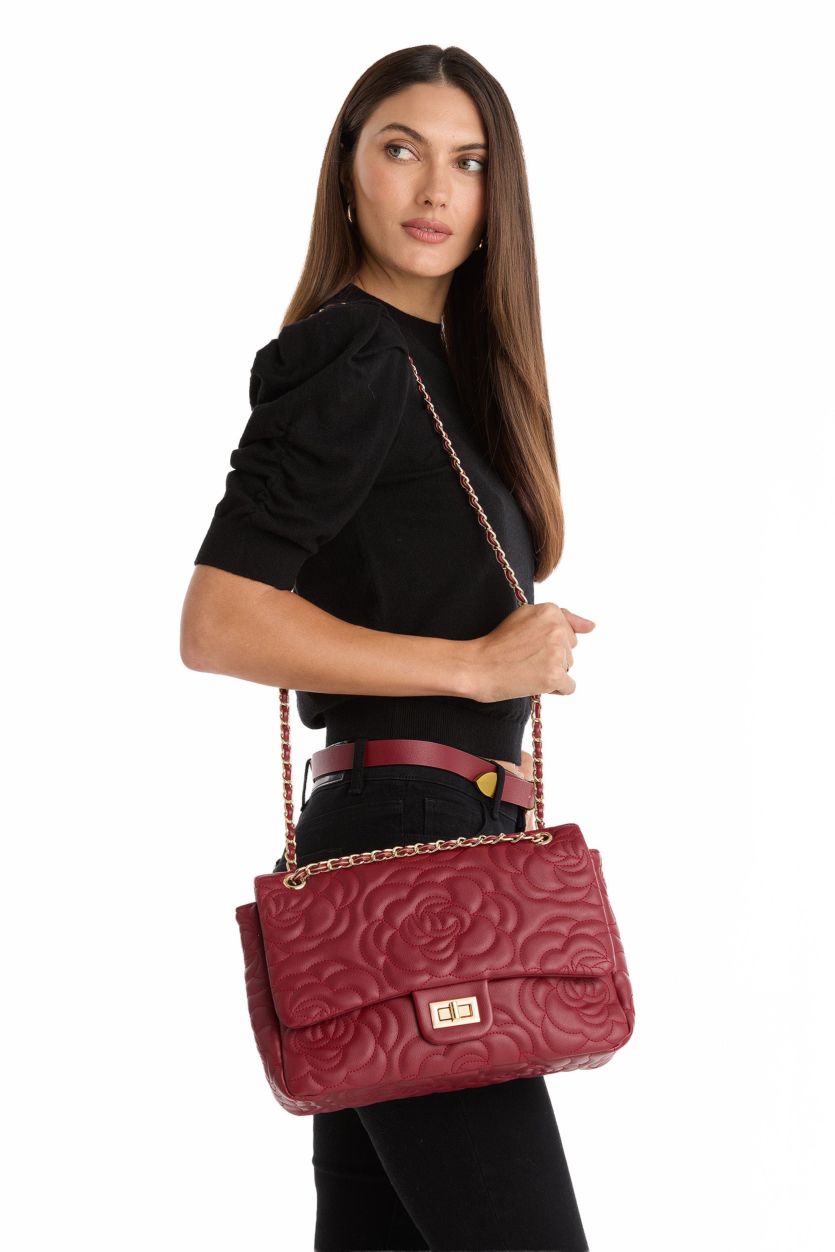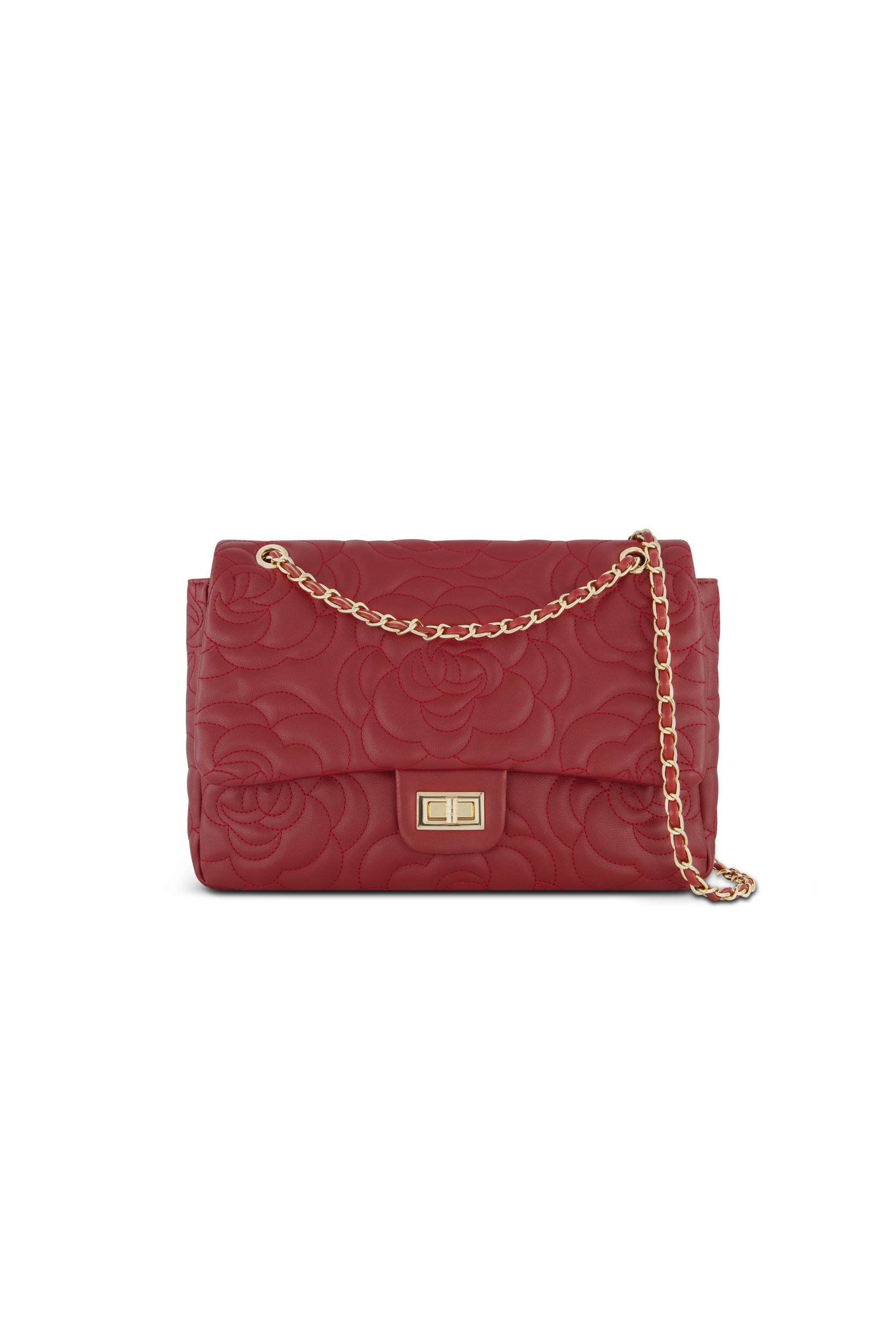 Romantic yet refined, the Alessia Bag is a true statement piece. Featuring an intricate rose-embossed design, it blends timeless femininity with modern sophistication. The structured silhouette is accented by a gleaming gold turn-lock closure and a delicate chain strap that can be worn on the shoulder or crossbody for versatile styling. Spacious enough to hold your essentials while maintaining its sleek shape, the Alessia is the perfect companion for both daytime polish and evening elegance.