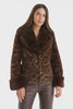 A woman stands against a white background wearing the Sydney Fur Trim Coat in leopard print, styled with a brown top, brown leather pants, gold pointed-toe heels, layered necklaces, and a chain belt.