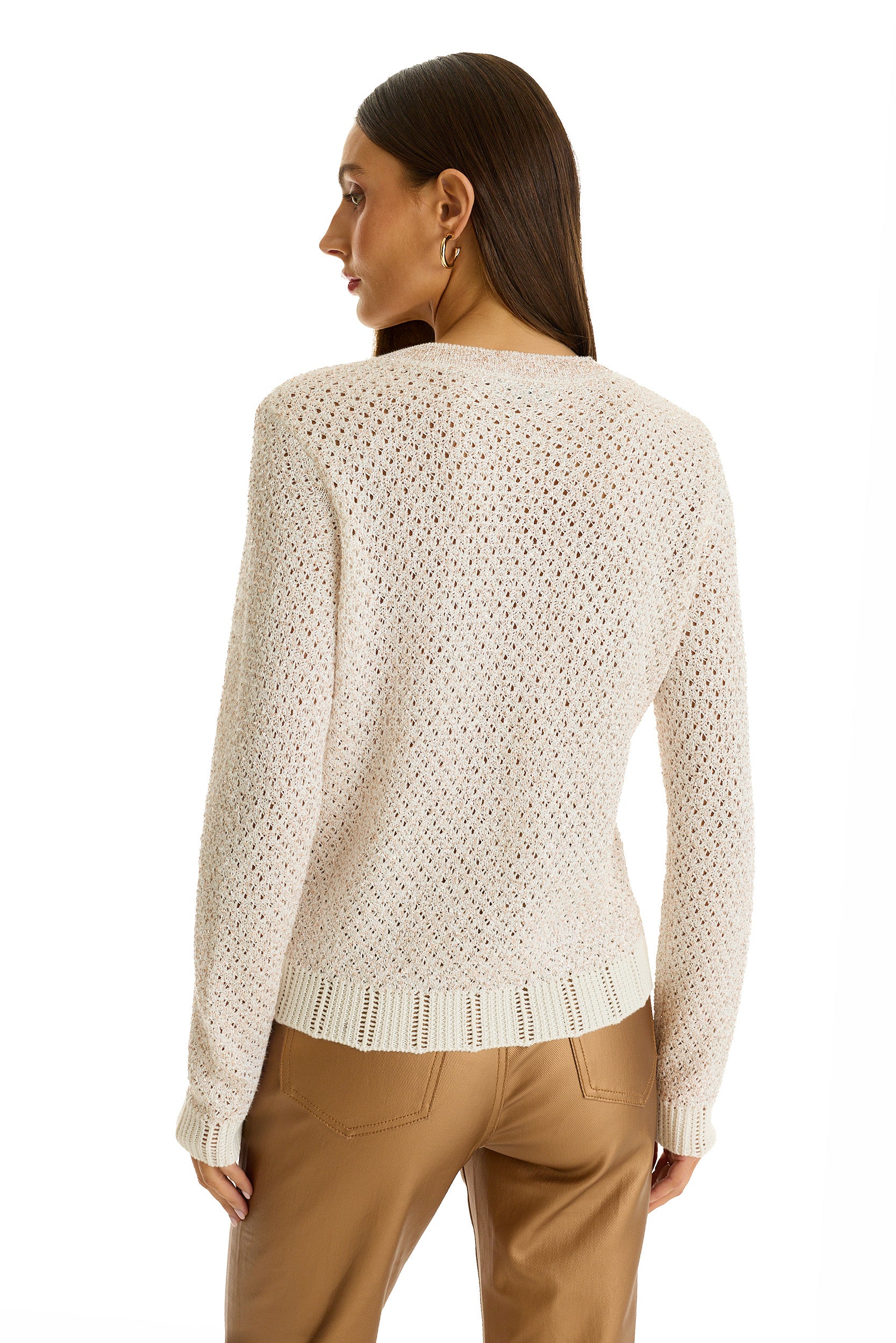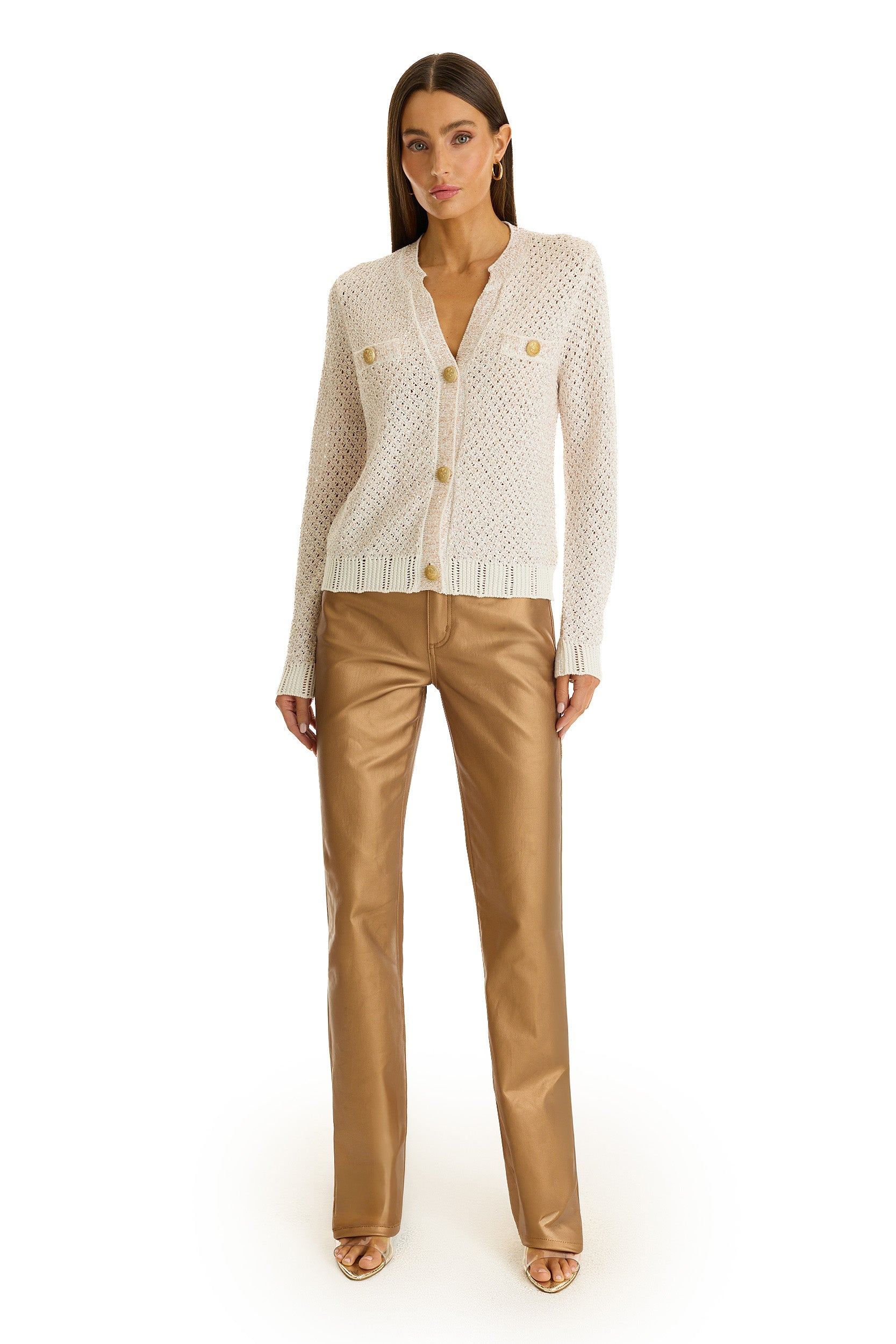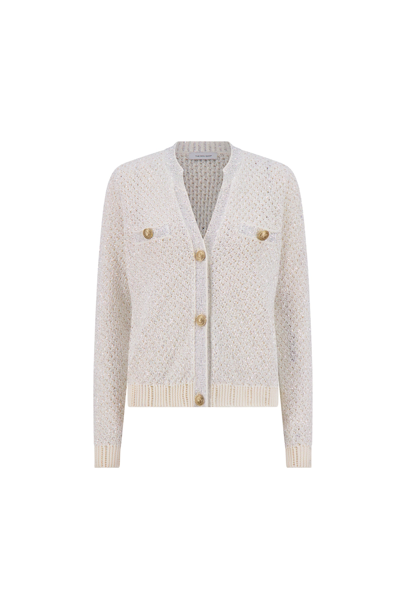The Shannon Sequin Cardigan Top in Pearl combines warm-weather dressing with eye-catching glamour. Crafted from open knit fabric, this long-sleeve piece features a relaxed silhouette enhanced by embossed gold dome buttons that add a touch of luxury. The subtle shimmer of sequins catches the light beautifully, making it perfect for elevated occasions or polished everyday styling.