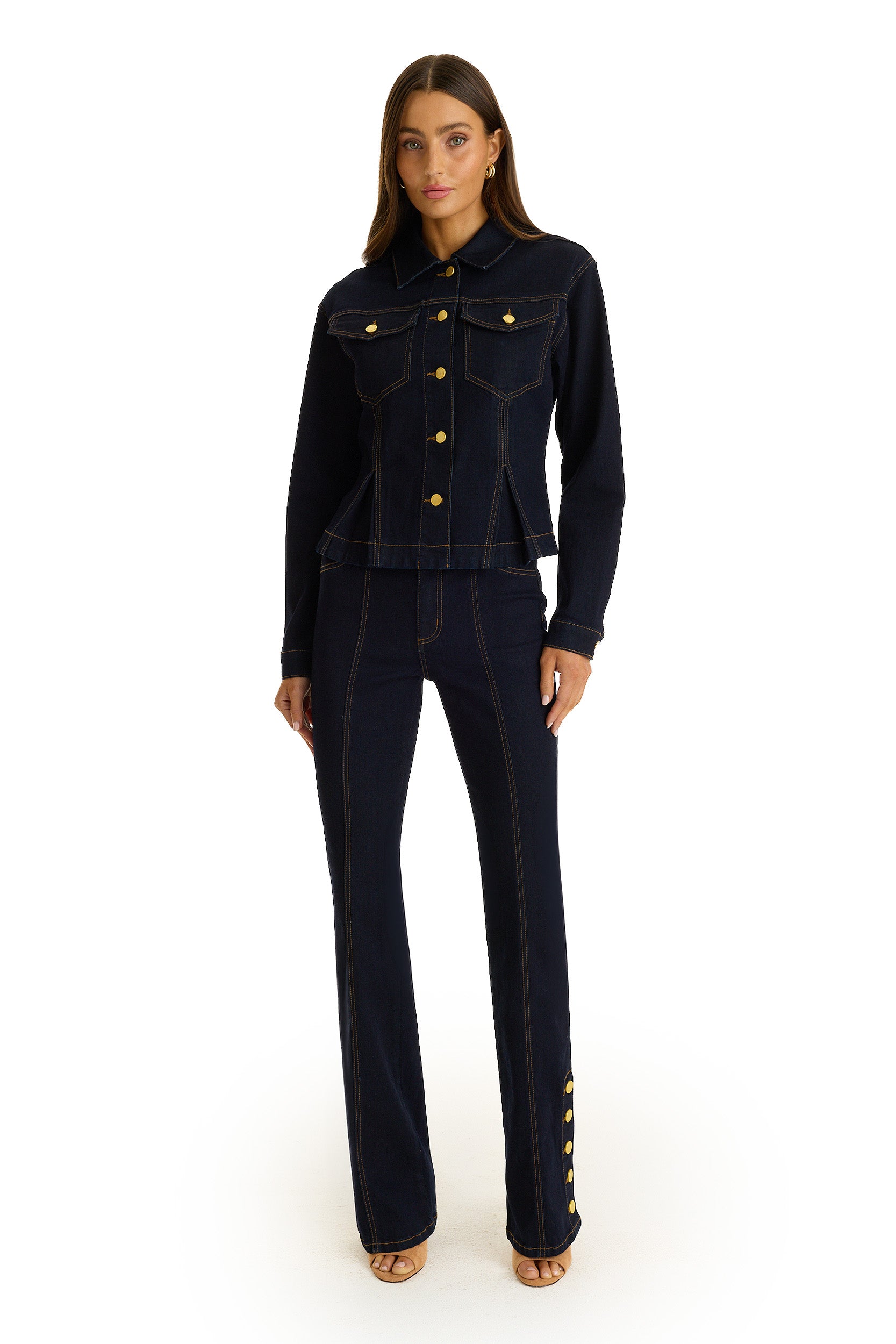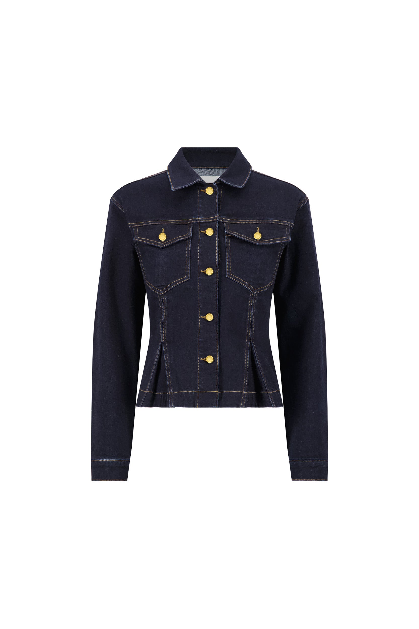Introducing the Bethanie Denim Jacket, where timeless tailoring meets contemporary edge. This sophisticated piece features lustrous gold buttons that catch the light beautifully. The point collar and long sleeves deliver polished structure, while dual chest pockets blend practicality with style. A pleated peplum hem adds unexpected dimension to the classic fit, creating a jacket that commands attention whether dressed up or down