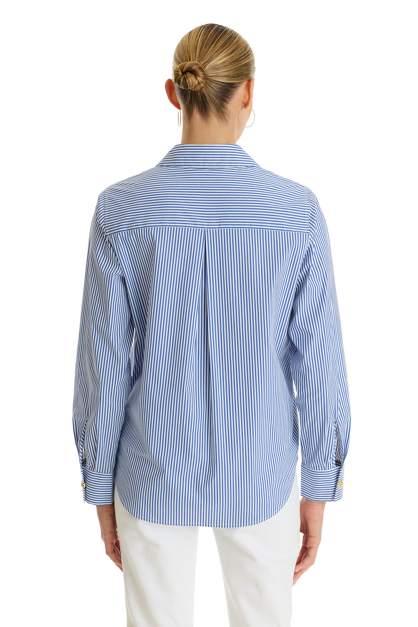 The Jasmine Shirt is your new go-to for effortless style. Crafted from stretch poplin, this crisp blue and white striped shirt features long sleeves, a flattering shirttail hem, and a pleated back yoke for subtle dimension. One-button cuffs and an embossed dome snap closure add charming details that elevate the everyday. Comfortable, polished, and ready for anything.