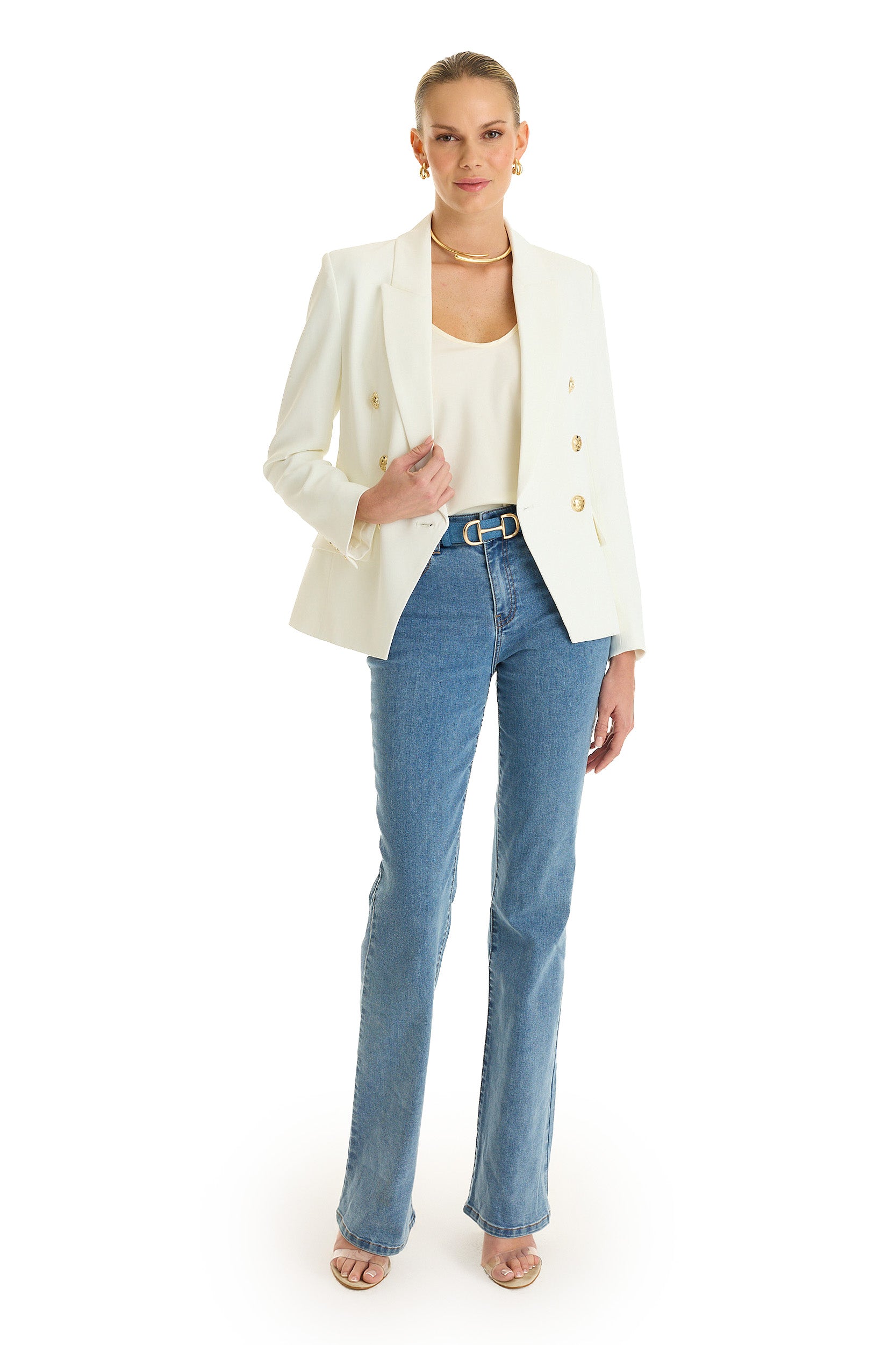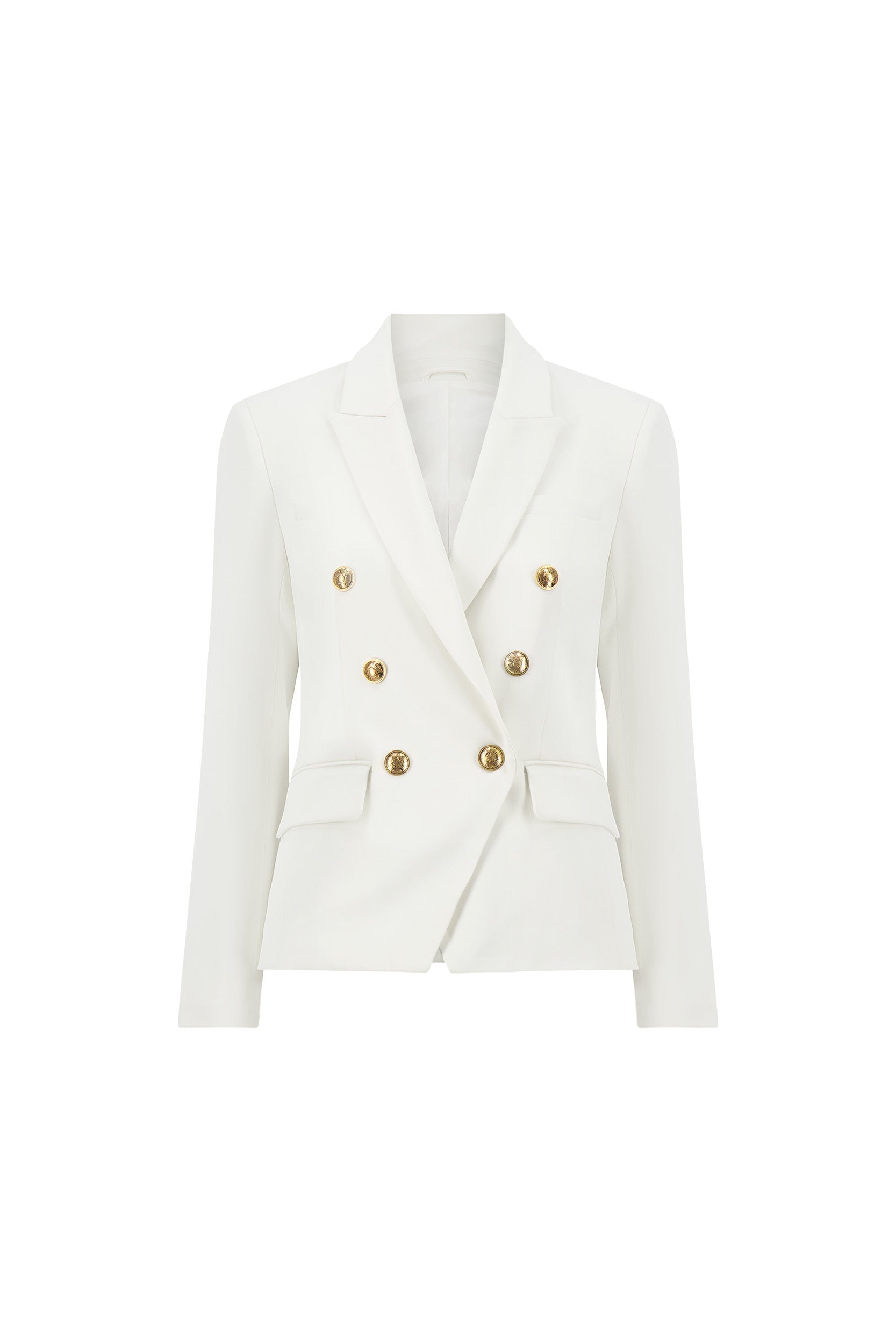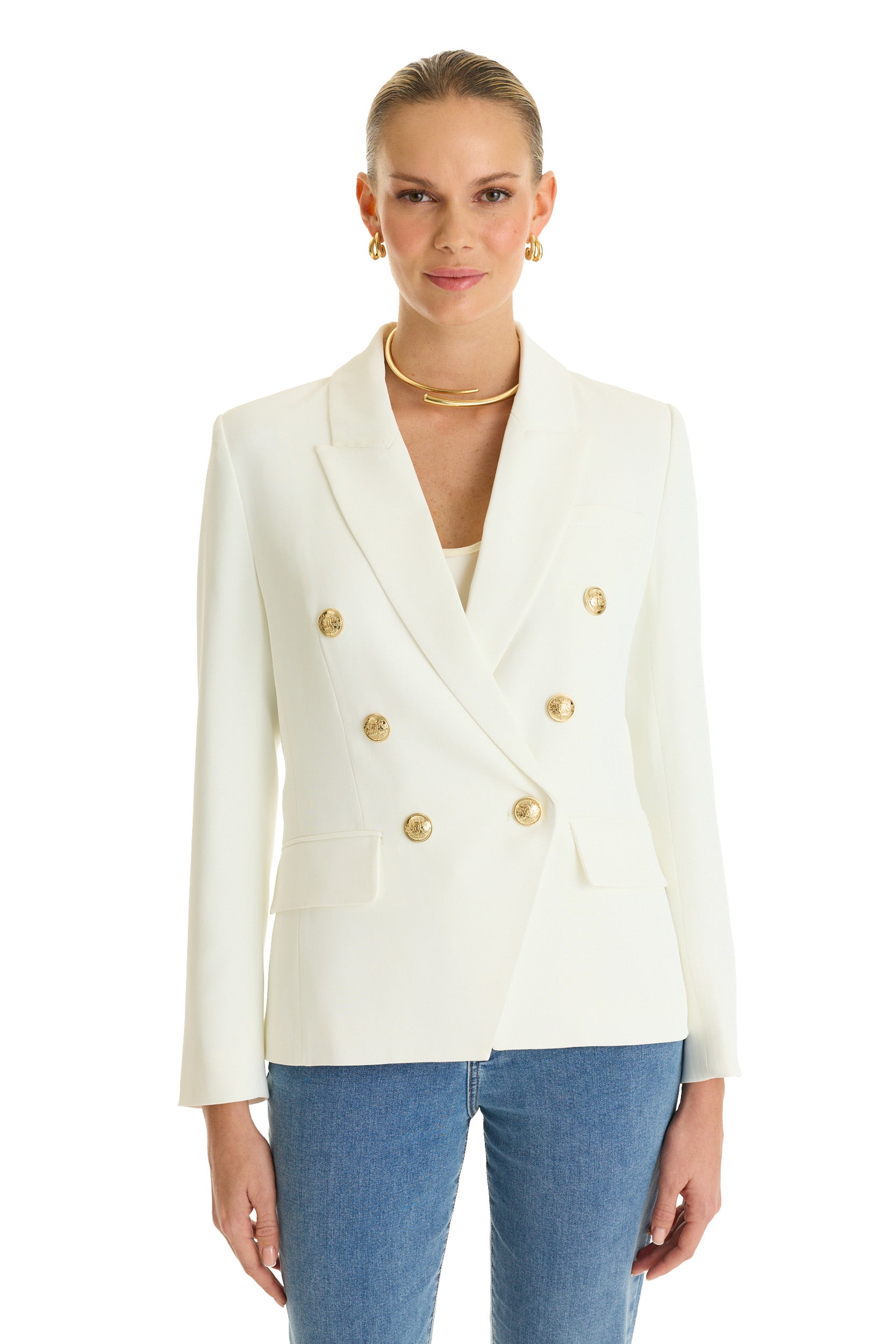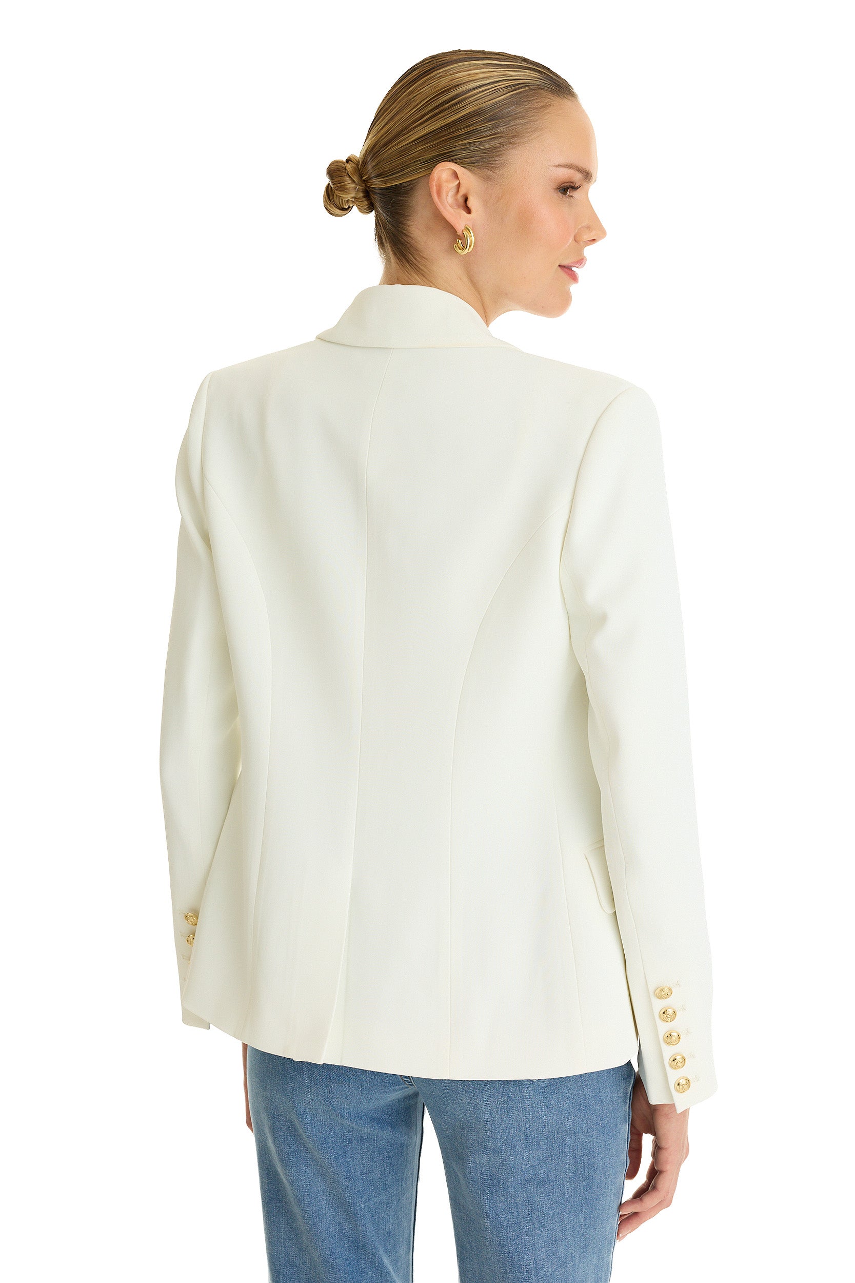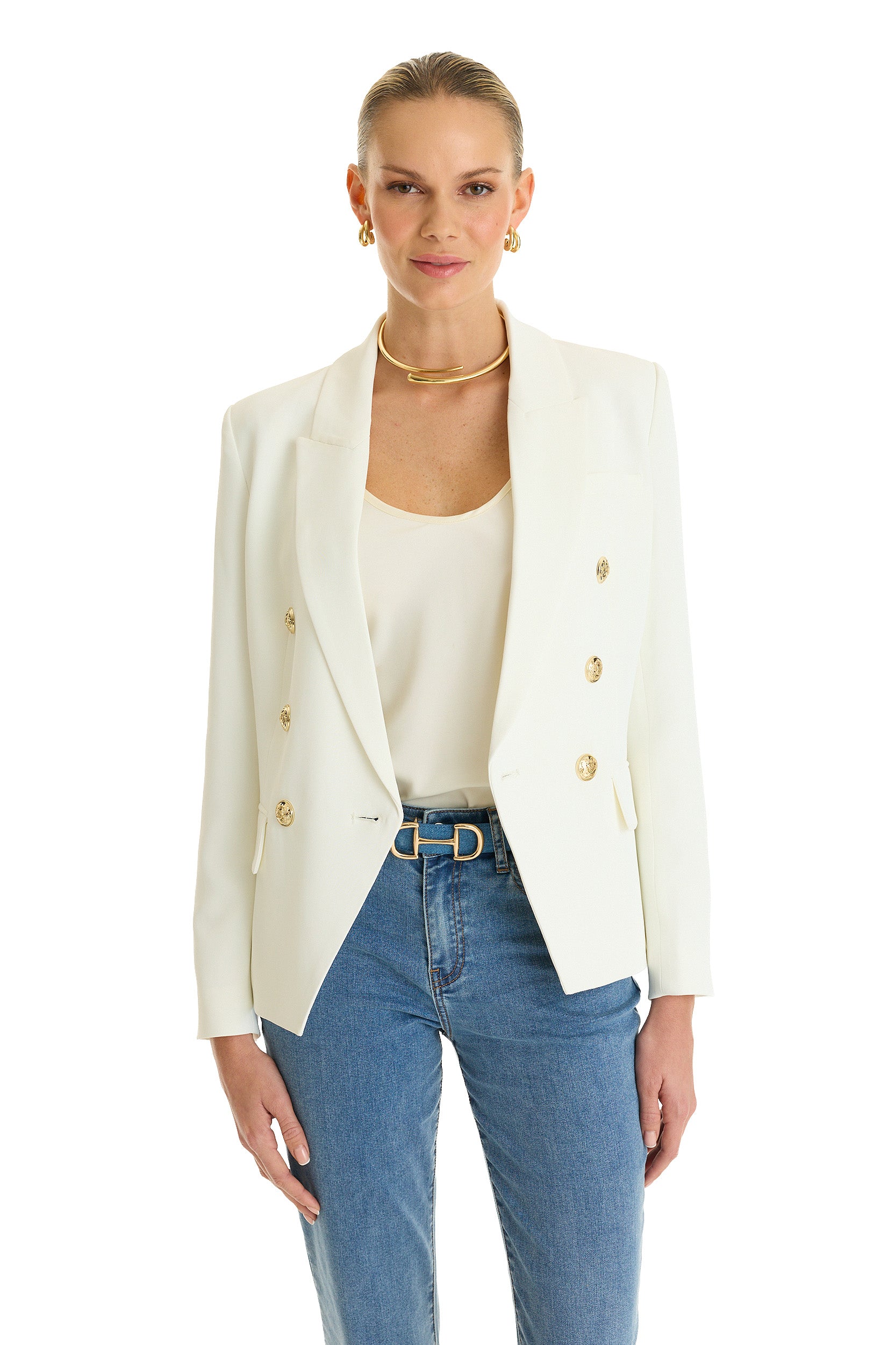 The Sasha Double Breasted Blazer is your instant outfit upgrade. Designed with luxurious suiting fabric with a tailored waist that hugs in all the right places, this blazer means business. Padded shoulders give you that flattering silhouette and commanding presence, while embossed gold dome buttons add a touch of glamour. Fully lined with welt pockets and a button closure, it's the perfect layer for any occasion. Wear it open with jeans and a cami or closed with your favorite trousers.