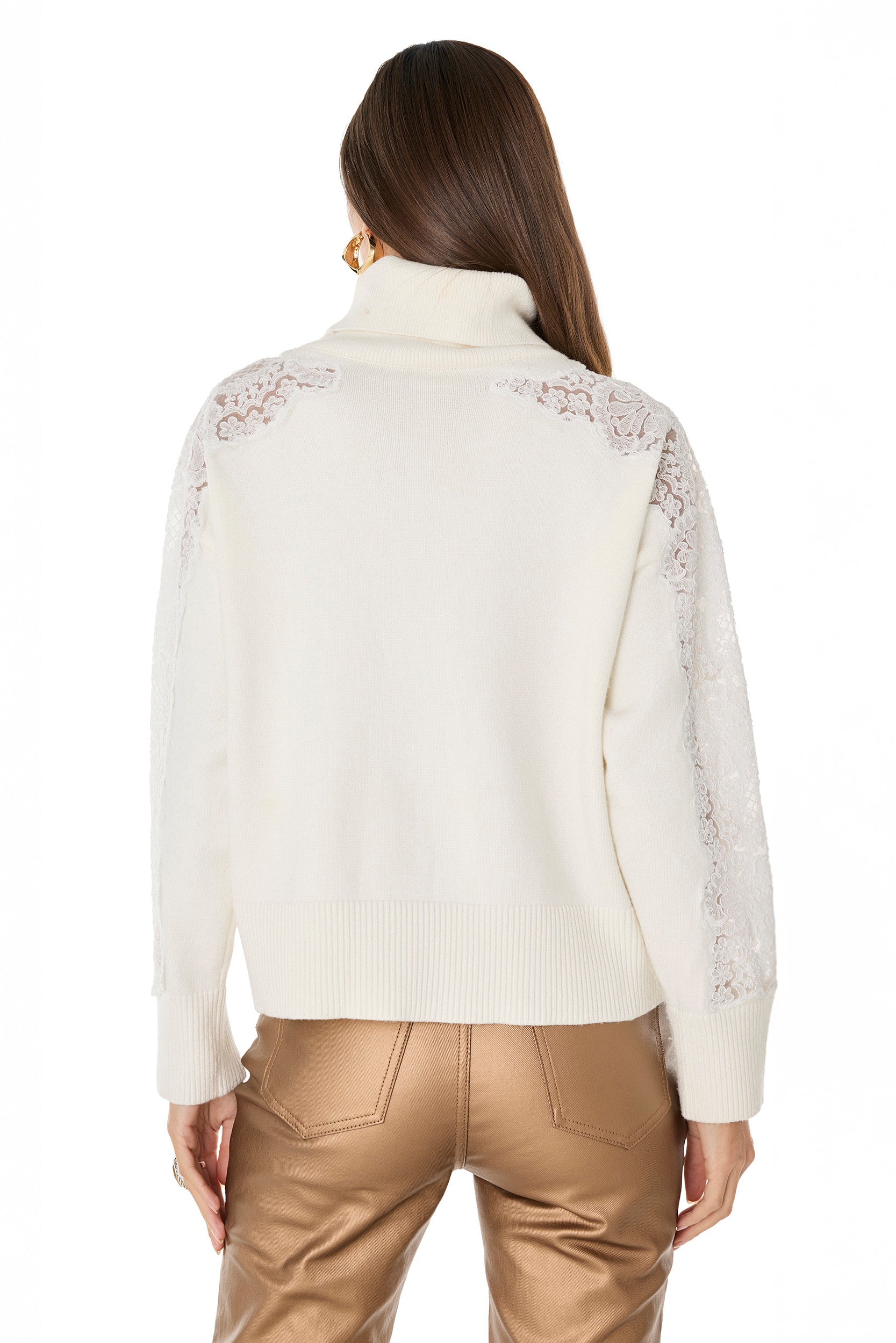 Stay warm in style with the Camille Lace Turtleneck Sweater in Pearl. Featuring delicately structured lace sleeves, this sweater pairs elegance with comfort through its ultra-soft knit body. Designed for a perfect fit, it layers effortlessly, making it an ideal choice for refined, versatile styling.