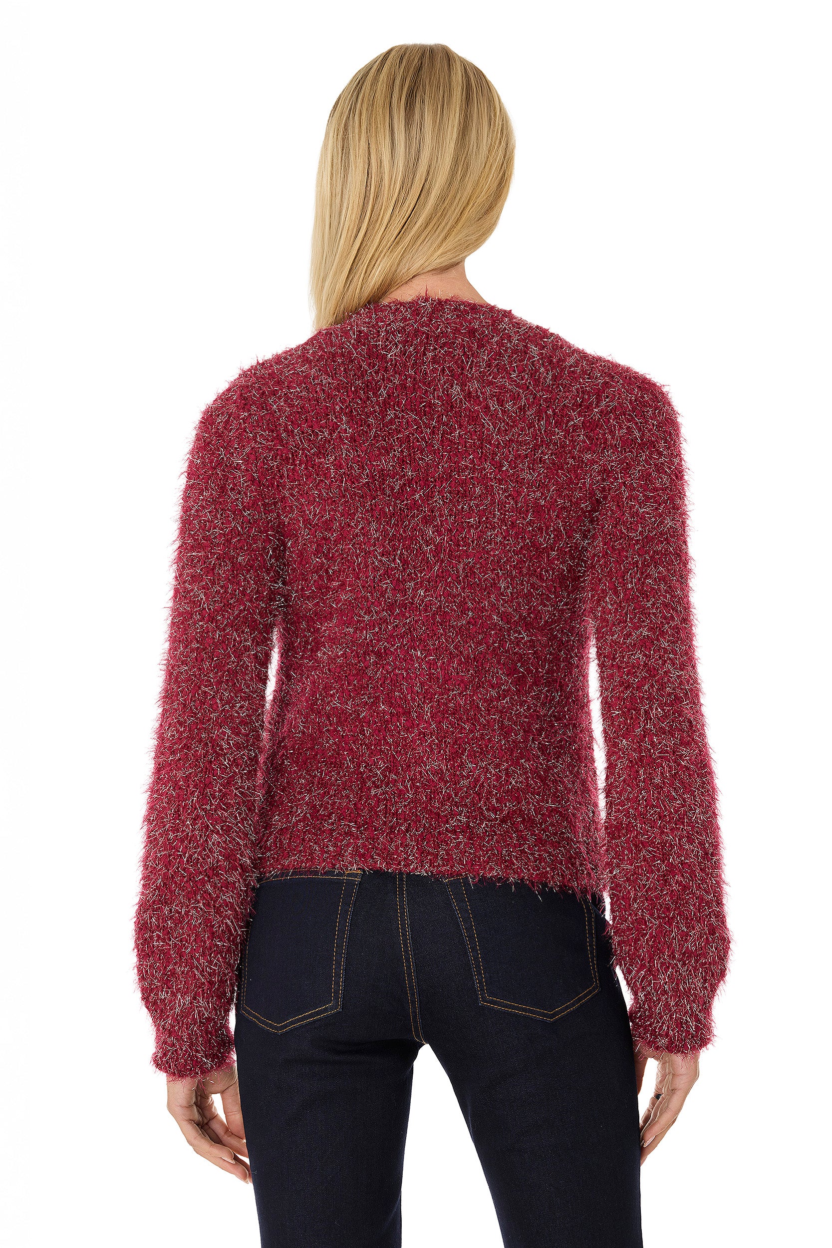 Timeless, elegant and chic - the Loretta Knit Cardigan Top is the perfect crew-neck cardigan. Designed with a fluffy sparkle knit that's structured yet ultra soft, this style features padded shoulders and luxe gold Noli embossed dome buttons.