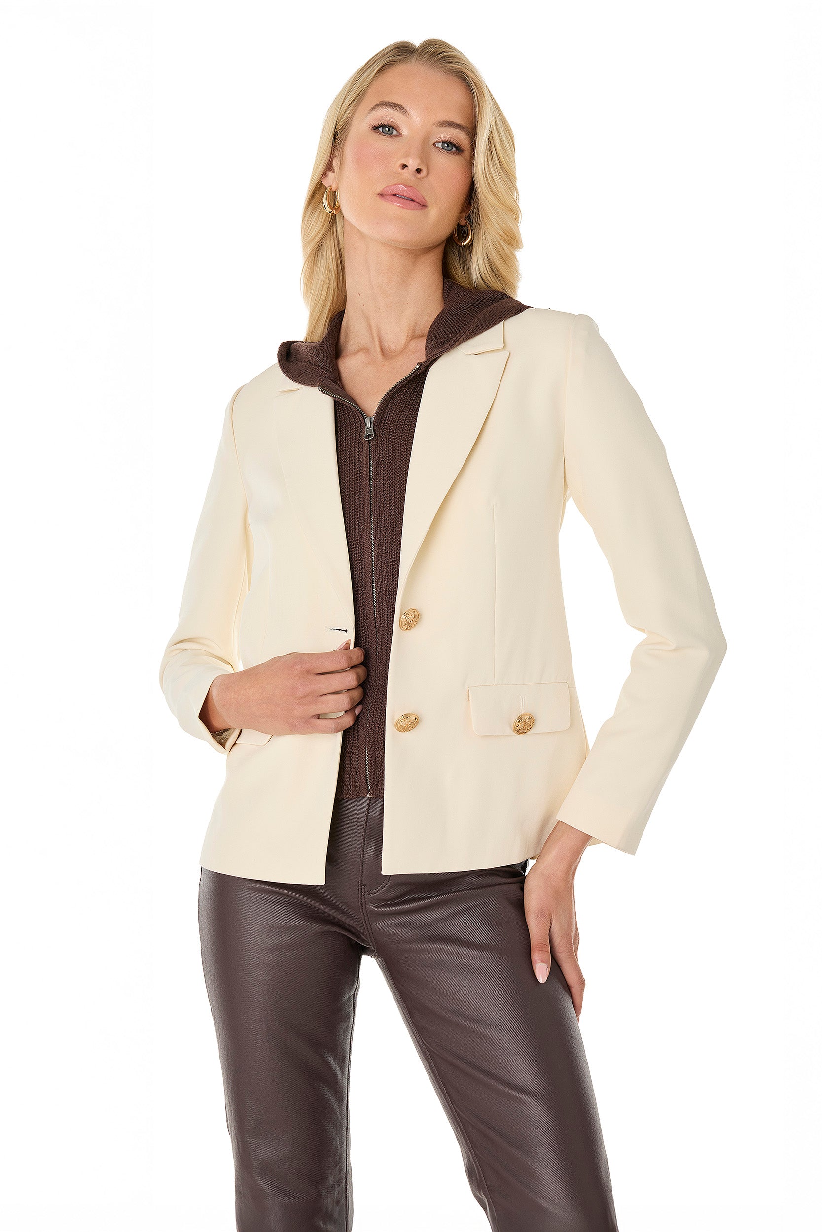 Elevate your wardrobe with the Kara Dickey Blazer. Crafted from transitional suiting fabric with a hint of stretch, it offers both comfort and a sleek silhouette. Decorative crest buttons add a touch of timeless elegance, making it an essential piece for any sophisticated ensemble. With the added detachable dickey knit insert, this style is perfect for any occasion.