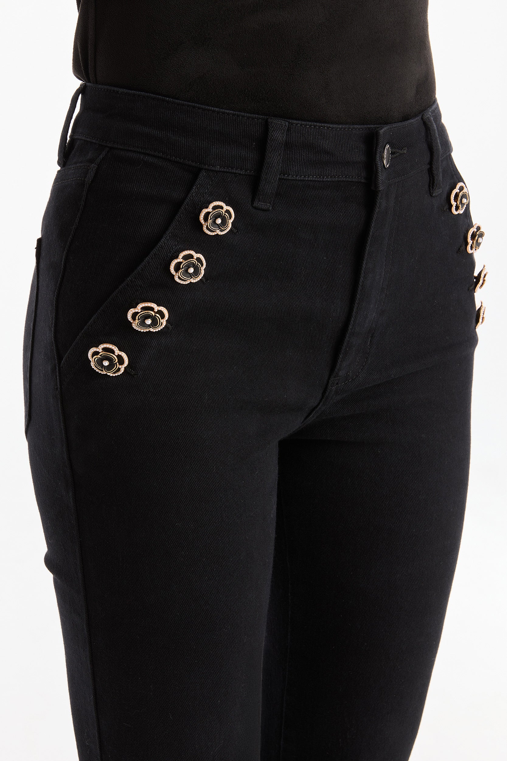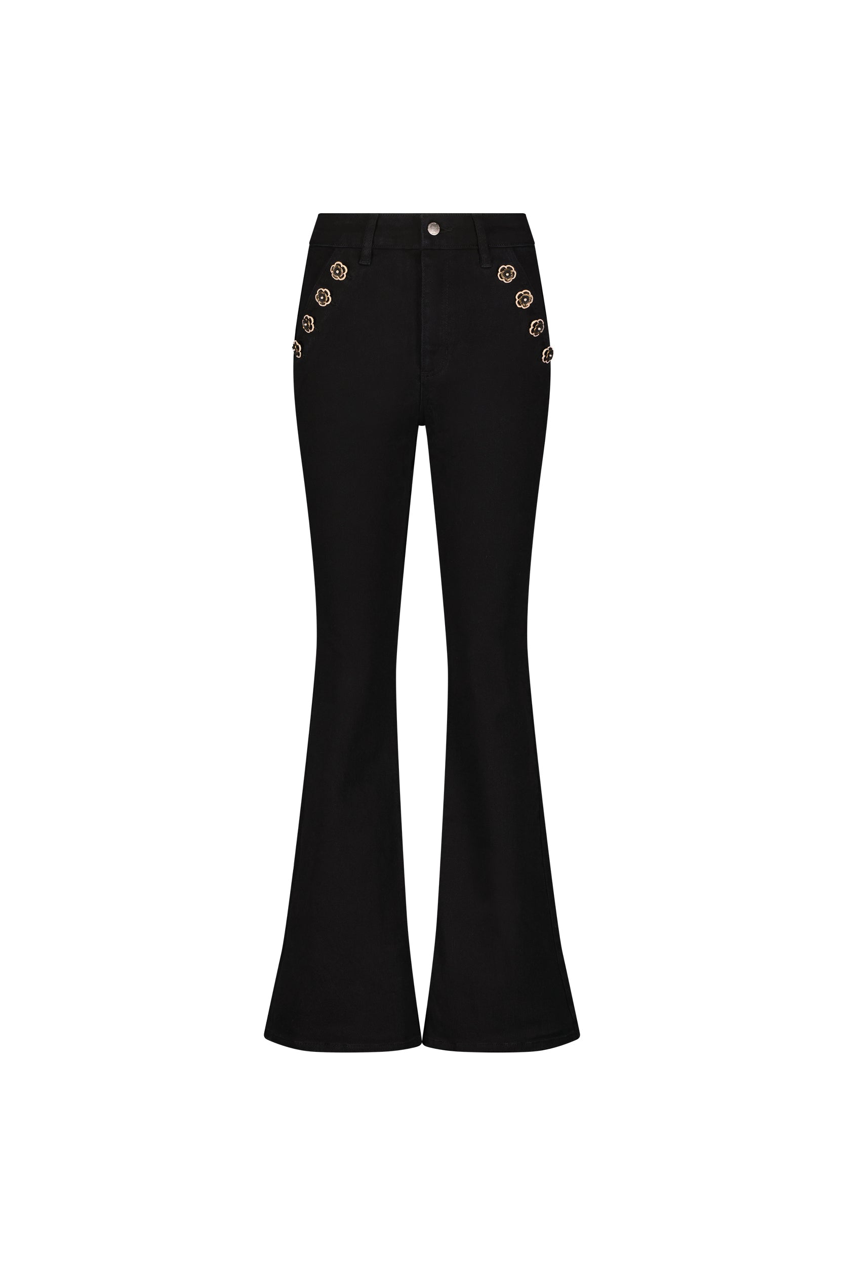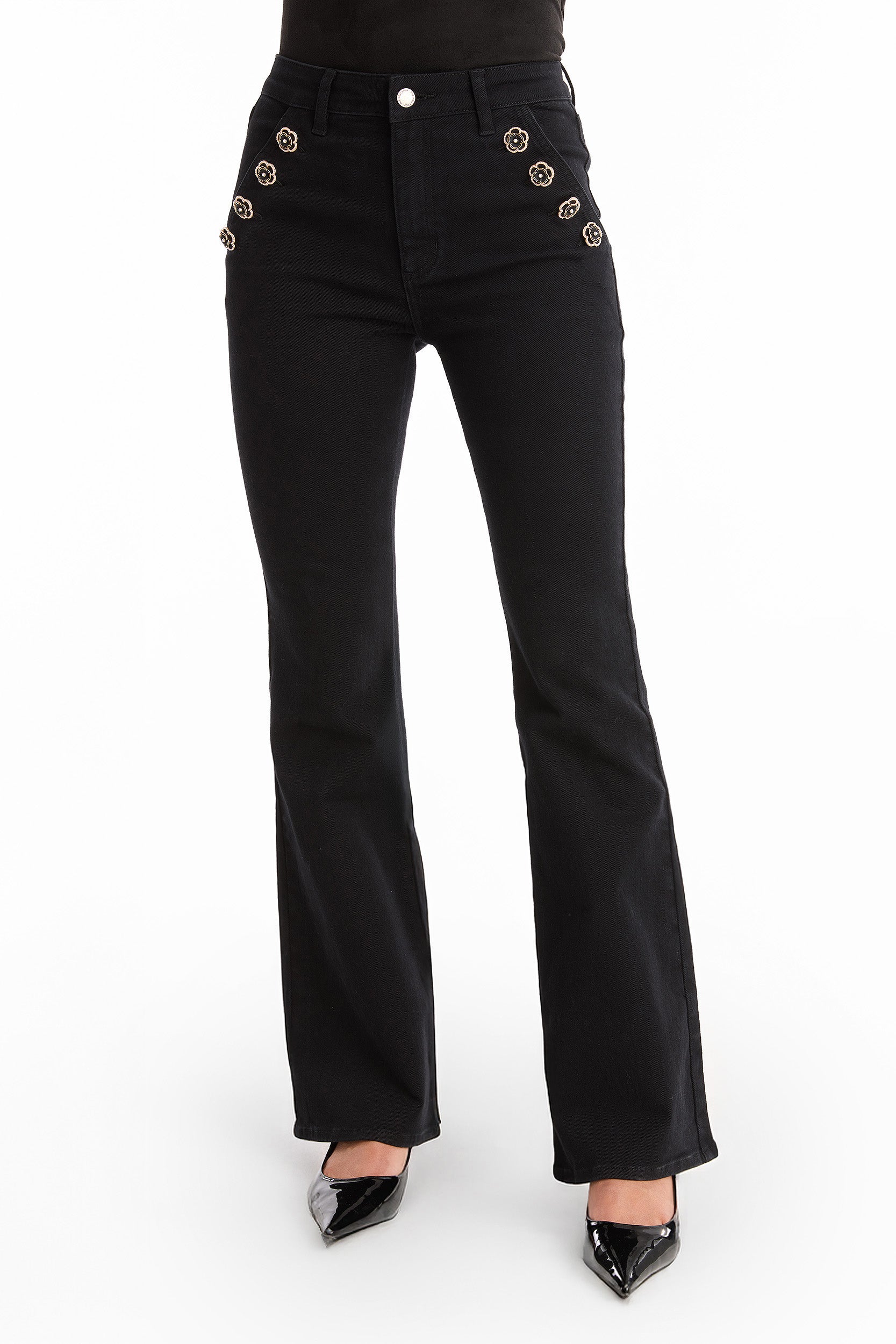 A modern take on a classic silhouette—the Allegra Rose Jean is designed to flatter and shape in all the right places. This jean hugs your curves and creates a streamlined look through the waist and hips, while the bootcut at the bottom adds a touch of vintage flair. Designer roses on the side buttons brings a hint of luxe to this everyday essential, making Allegra the perfect jean for both casual outings and dressier occasions. Pair with a silky blouse or a statement top for effortless, elevated style.