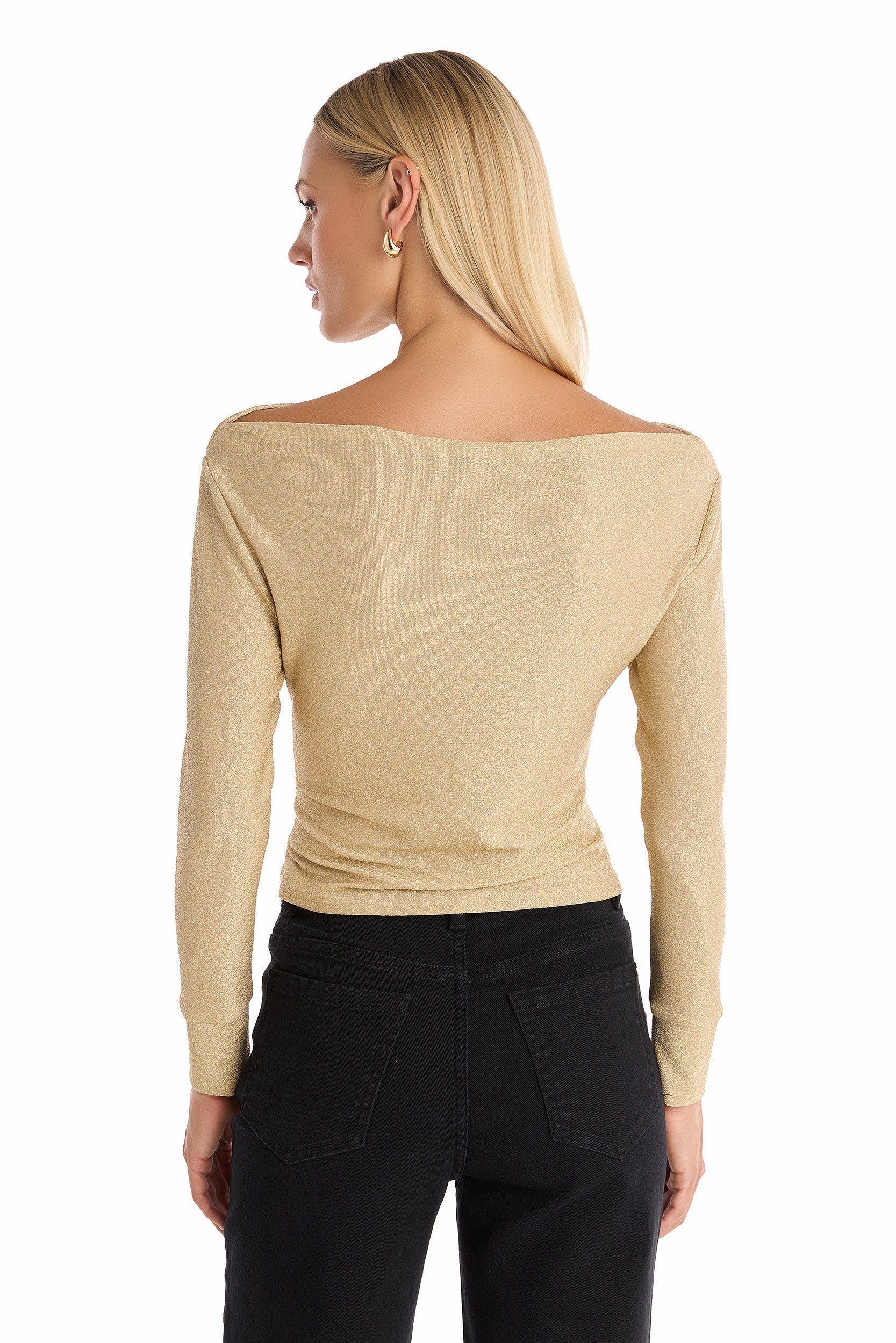 The Victoria Shimmer Top is the ultimate it-girl top. Designed with an elegant and alluring boat neck silhouette that can be worn on or off the shoulder, this piece is versatile for nights out, special occasions and anything in-between. Crafted from ultra-soft golden shimmer fabric, it offers stylish draping and long sleeves to enhance your features.