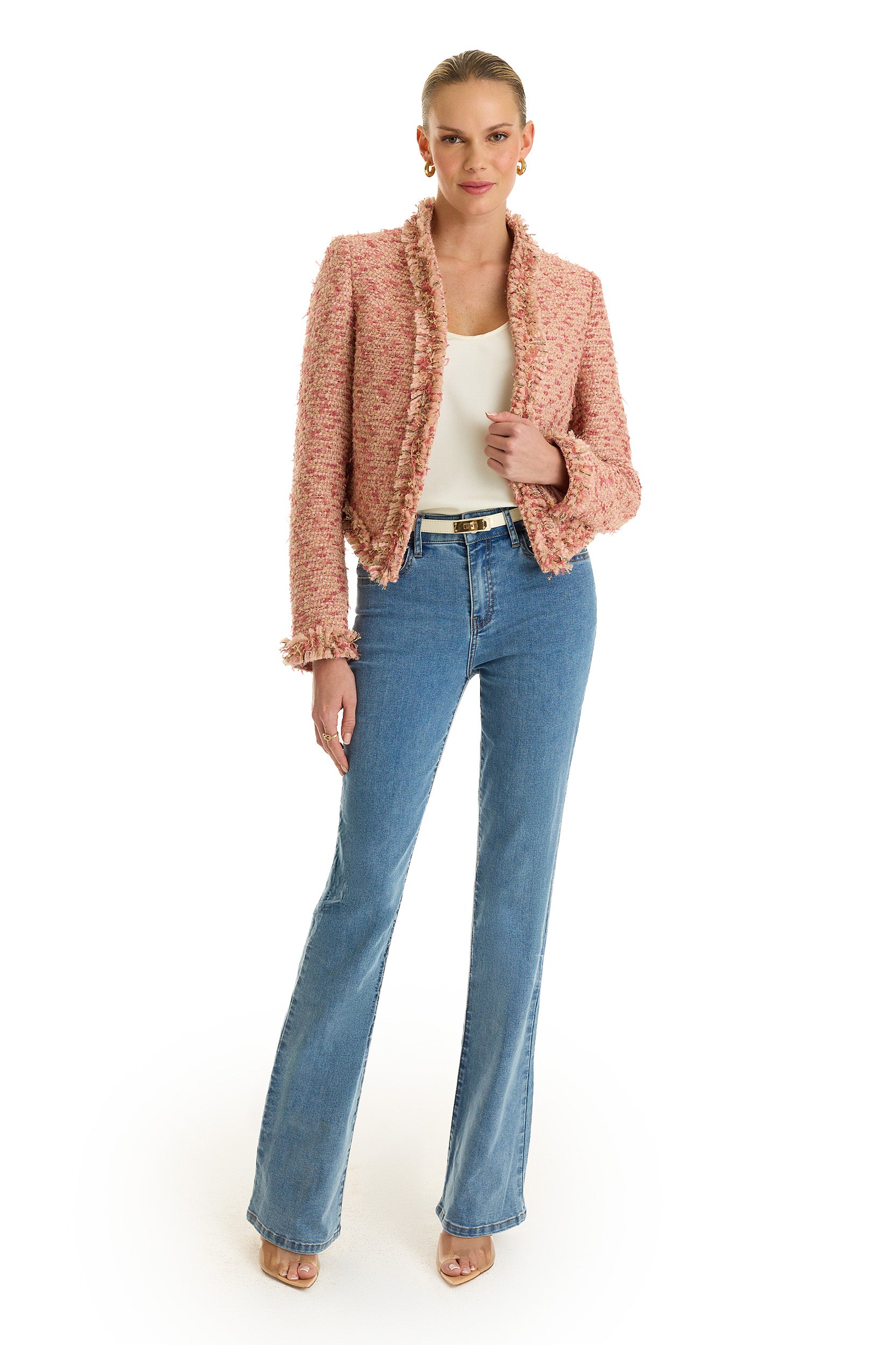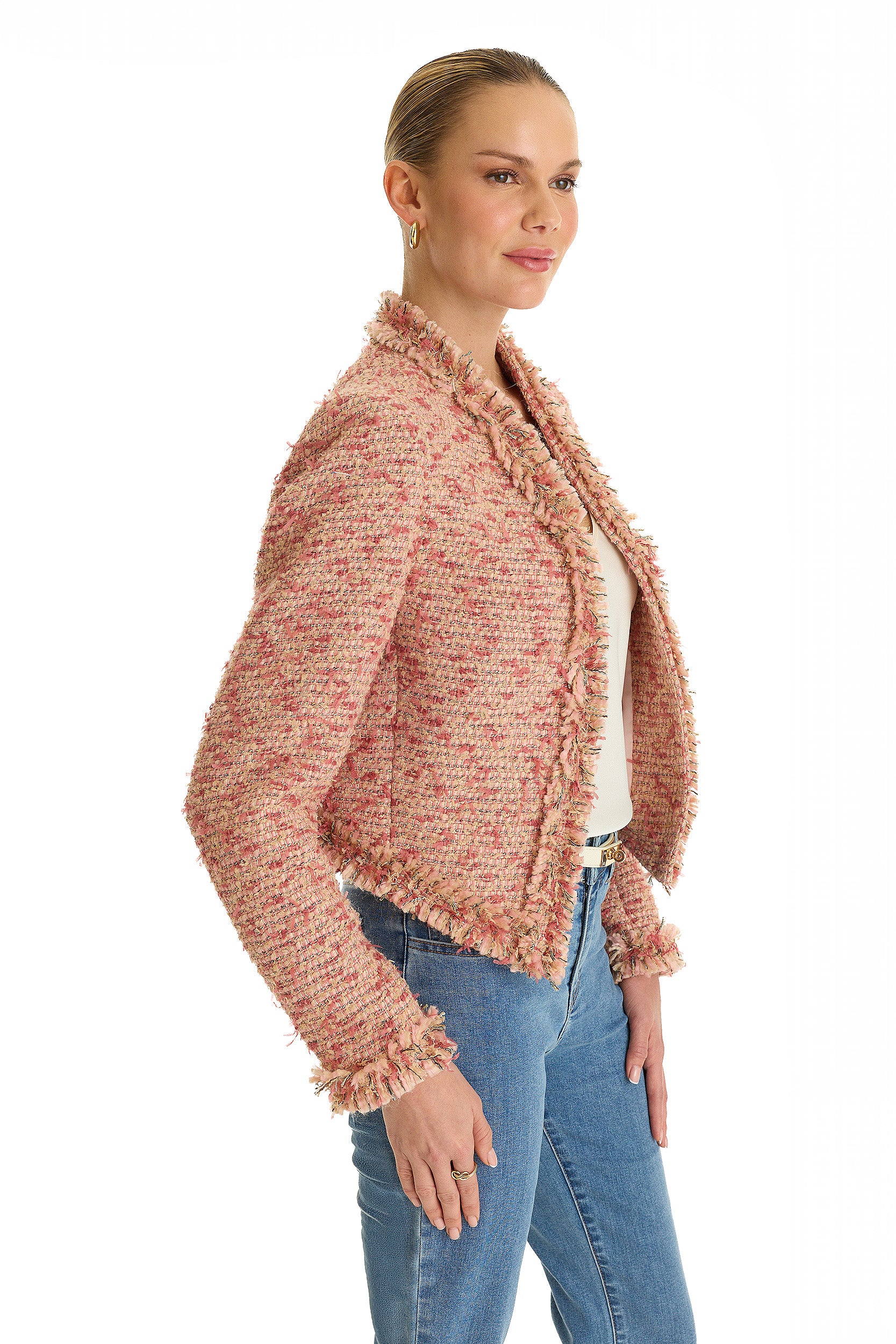 Luxurious tweed meets a captivating rose multi palette in the Florence Jacket. Featuring a soft fringe hem and open silhouette, this top adds femininity to your every day. Perfect for elevating both casual and polished ensembles, pair this piece with your favorite jeans and belt for a sophisticated statement.
