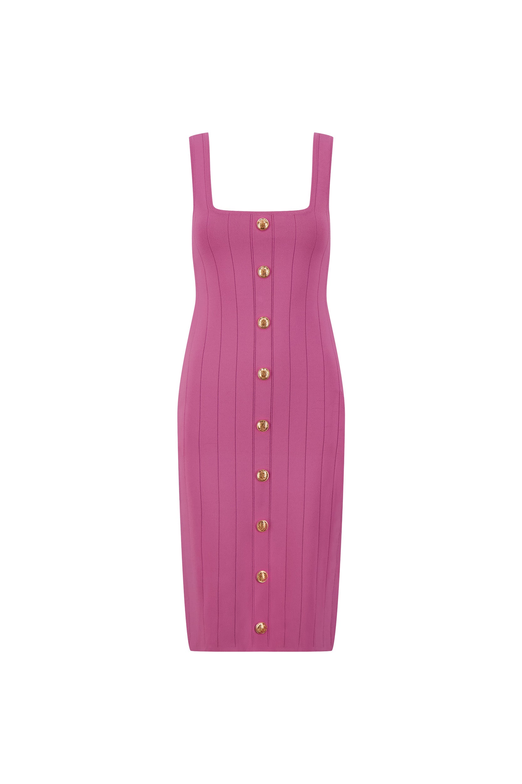 The Helena Button Dress in Petal Pink combines elegance with effortless style. Sculpted knit fabric features strategically placed lines that flatter your silhouette while the embossed gold dome buttons add a refined touch. Designed for warm-weather comfort, this dress transitions seamlessly from day to evening.