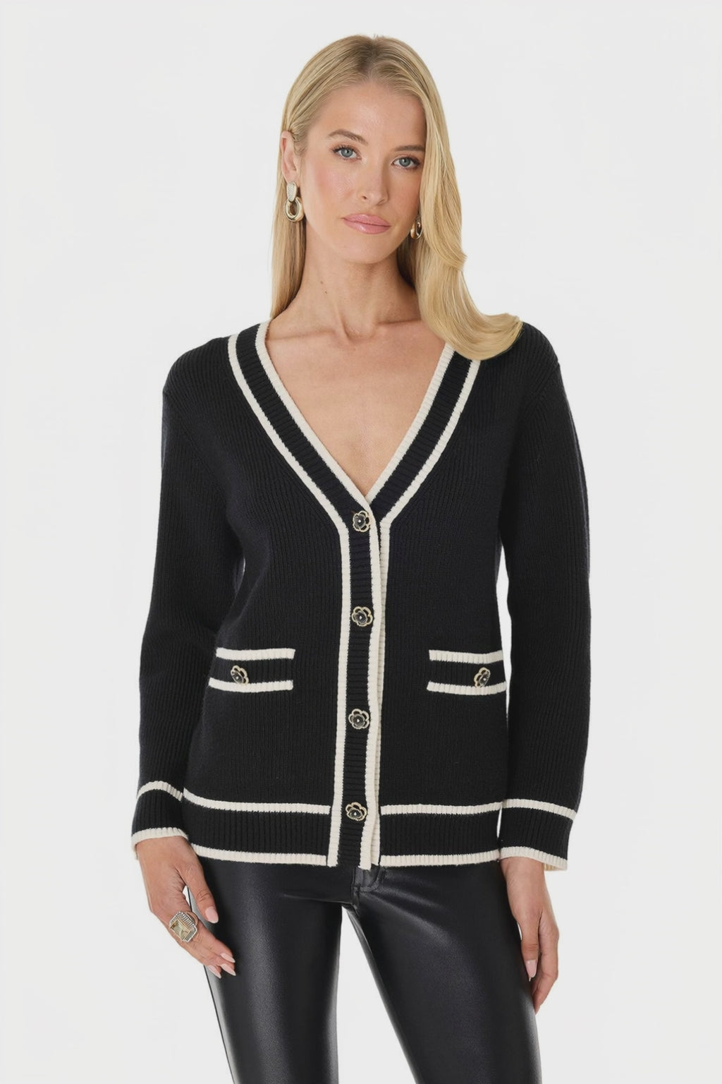 A romantic refresh to your wardrobe - meet the Devin Rose Contrast Cardigan. This sophisticated knit features a sleek v-neck and a striking colorblock design, enhanced by luxurious rose buttons. Long sleeves provide warmth, while buttoned front pockets offer elegant practicality for your essentials. Perfect for combining comfort with refined style.