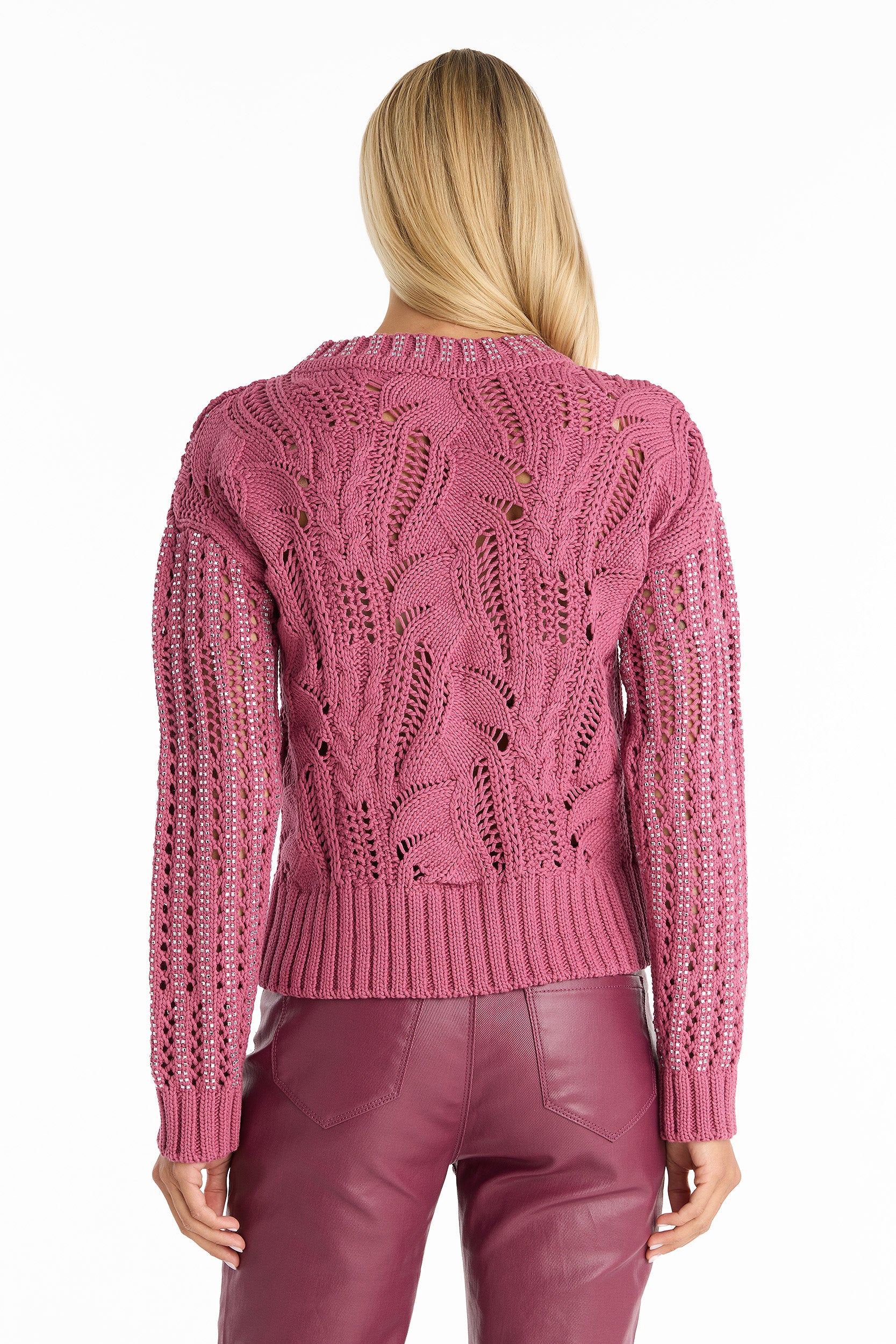 The Elea Crystal Knit Sweater brings out your inner shine in the most luxurious way. Featuring an intricate open knit design and adorned with sparkling crystal embellishments, this mid-length sweater with a classic crew neck adds a refined touch to your wardrobe, making it perfect for sophisticated layering and standout style.