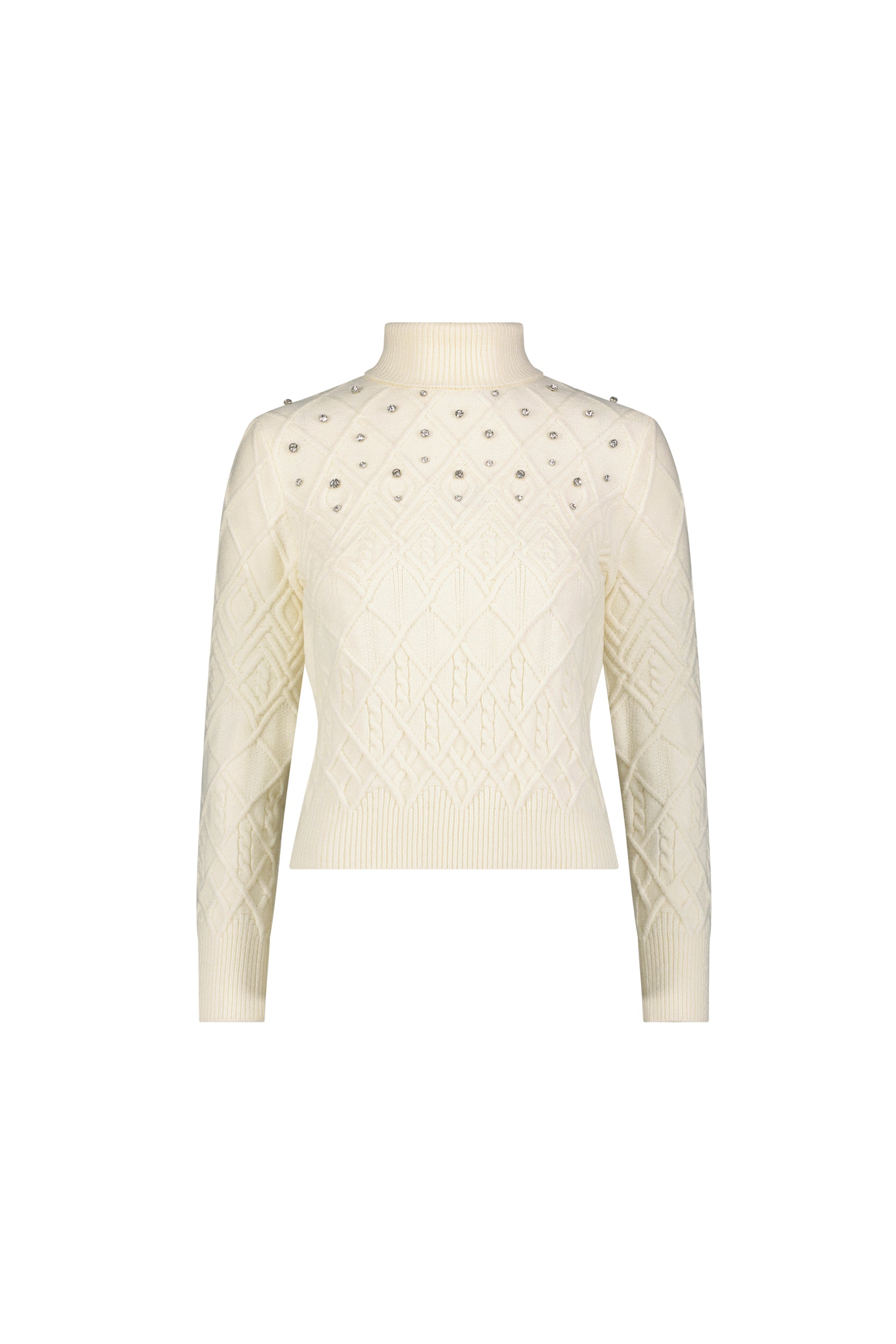 The Cara Crystal Sweater brings elevated charm to your seasonal layering. Designed in a soft, cable-knit texture with a refined diamond pattern, this turtleneck silhouette is accented with crystal embellishments for a subtle touch of shine. Its fitted hem and ribbed cuffs create a flattering shape, blending cozy sophistication with understated glamour. Pair it with leather pants or coated denim for a polished winter look.