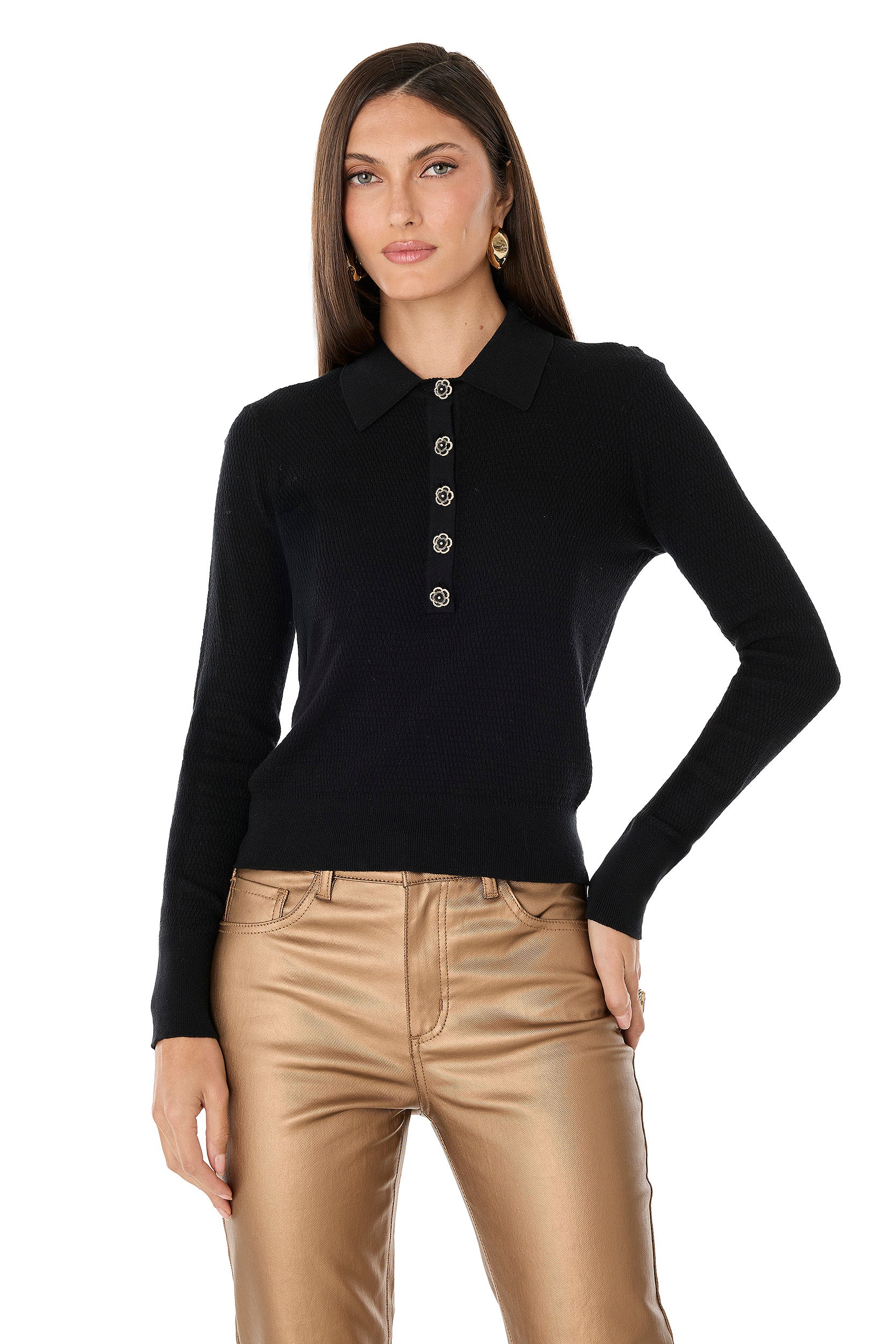 The Darla Rose Polo Shirt combines classic sophistication with a romantic touch. Featuring a refined polo collar and long sleeves, it offers comfortable elegance for any occasion. Delicate rose-shaped buttons adorn the partial front closure, adding a subtle, charming detail that elevates your wardrobe with understated grace.