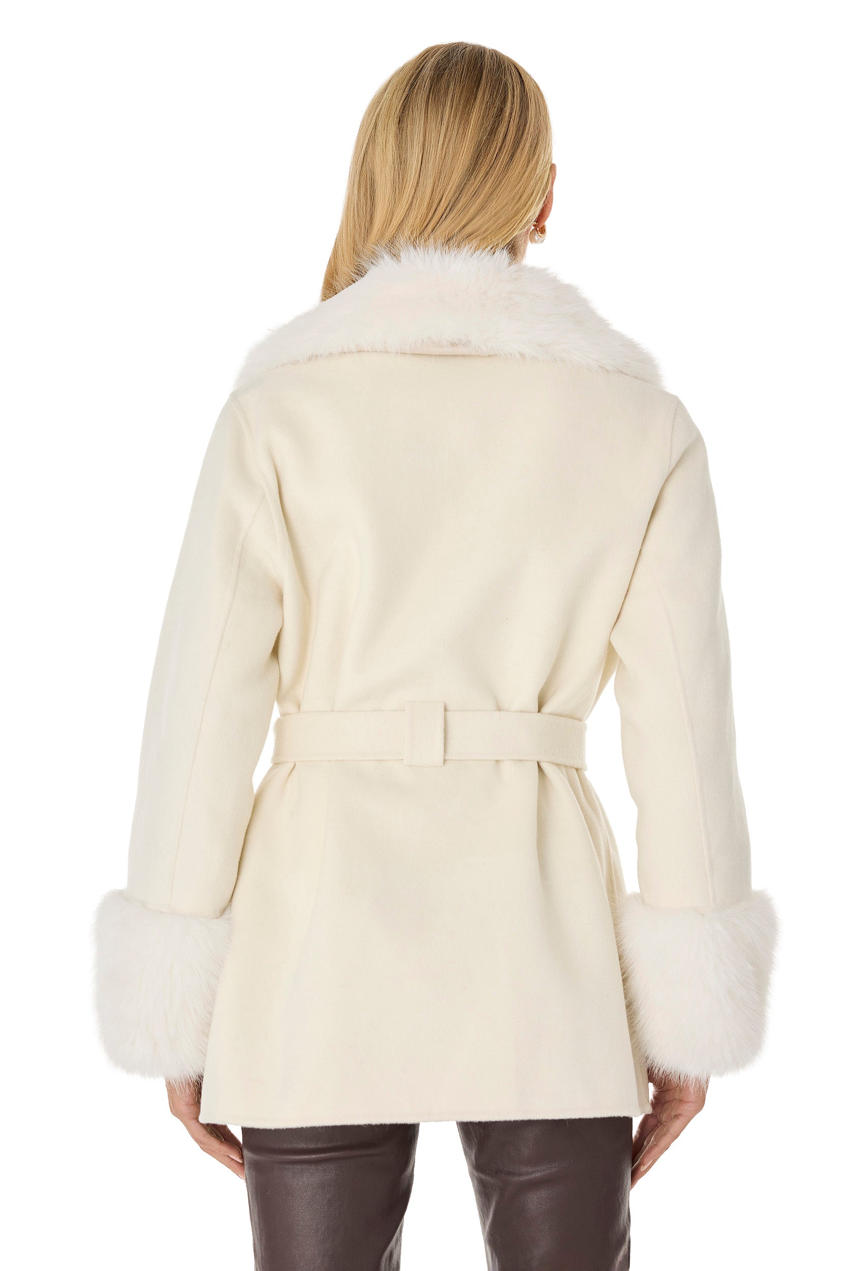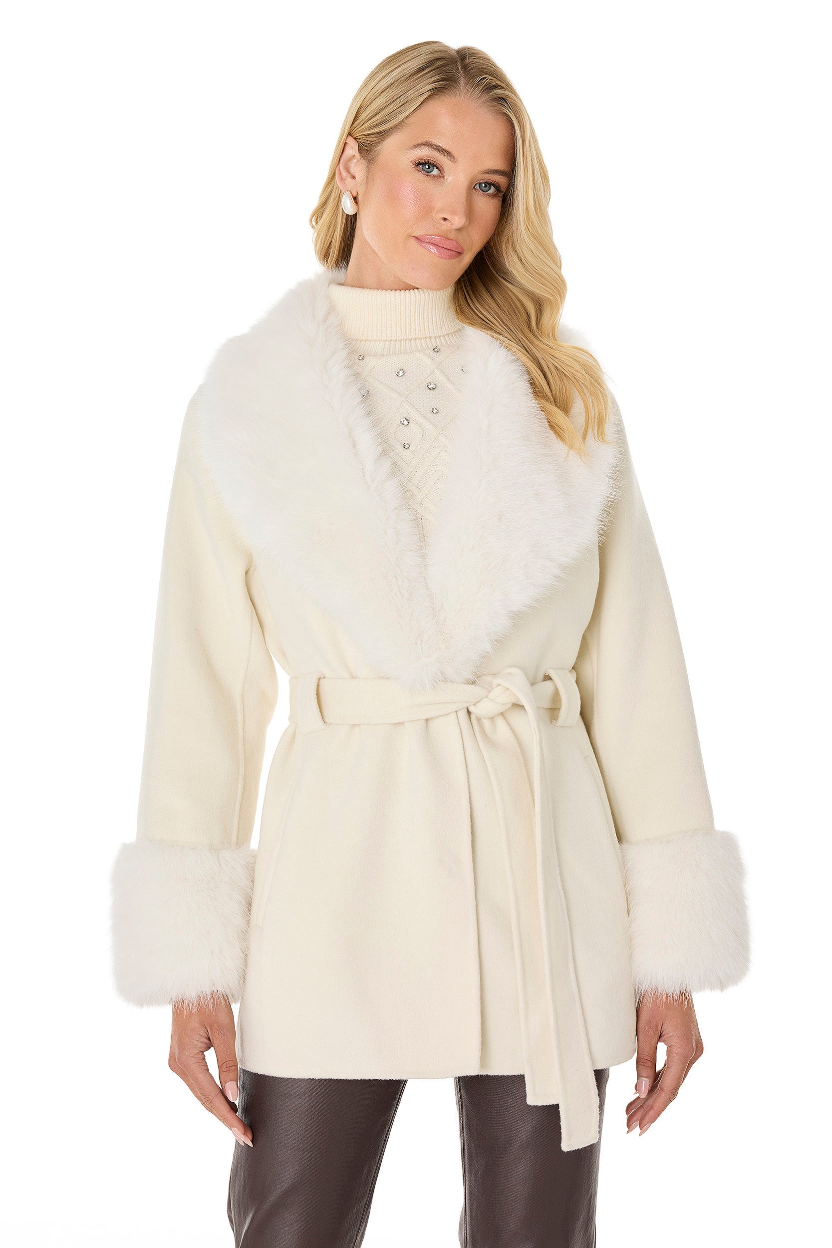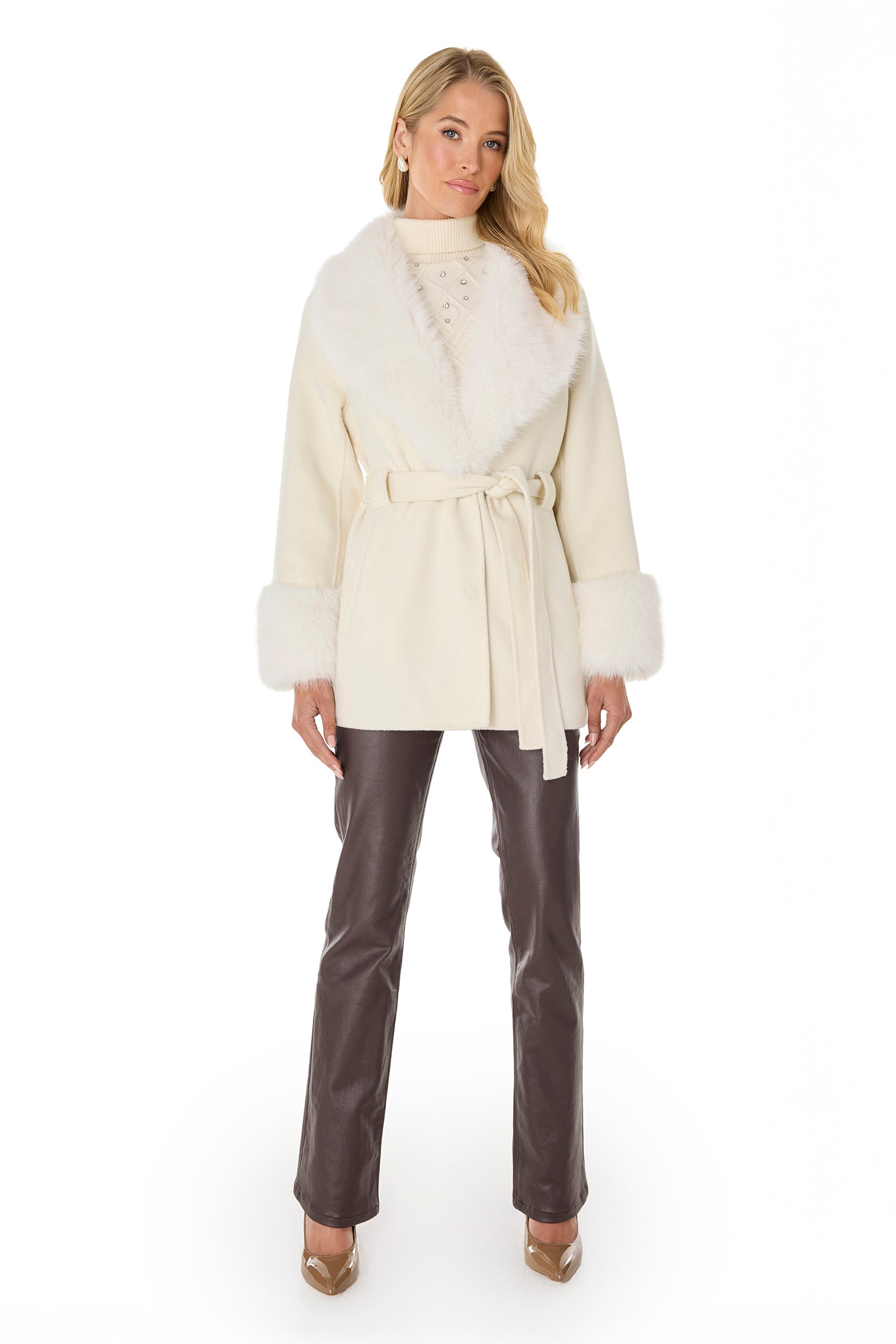 The Isabel Fur Trim Coat combines luxury and practicality for a sophisticated and alluring jacket for all occasions. Its elegant drape and stylish monochromatic color create a timeless silhouette, accentuated by a matching wrap belt to define your waist. This coat offers refined warmth with impeccable style for any occasion and pairs perfectly with our signature coated denim.
