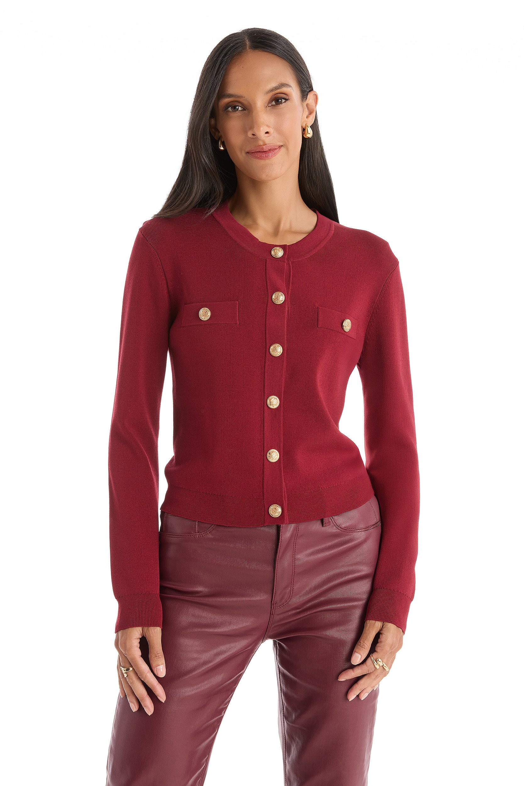 Timeless, elegant and chic - the Loretta Knit Cardigan Top is the perfect crew-neck cardigan. Designed with a structured knit that's structured yet soft, this style features padded shoulders and luxe gold Noli embossed dome buttons.