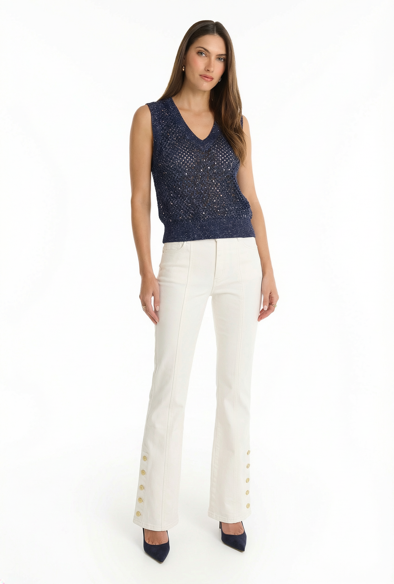 Embrace effortless chic style in the Addison Top. This stunning top is meticulously crafted with an intricate knit that weaves in shiny lurex and sparkling sequins for a glamorous, resort-ready look. Its airy silhouette and v-neck make it the perfect choice for sun-drenched days and glamorous evenings.