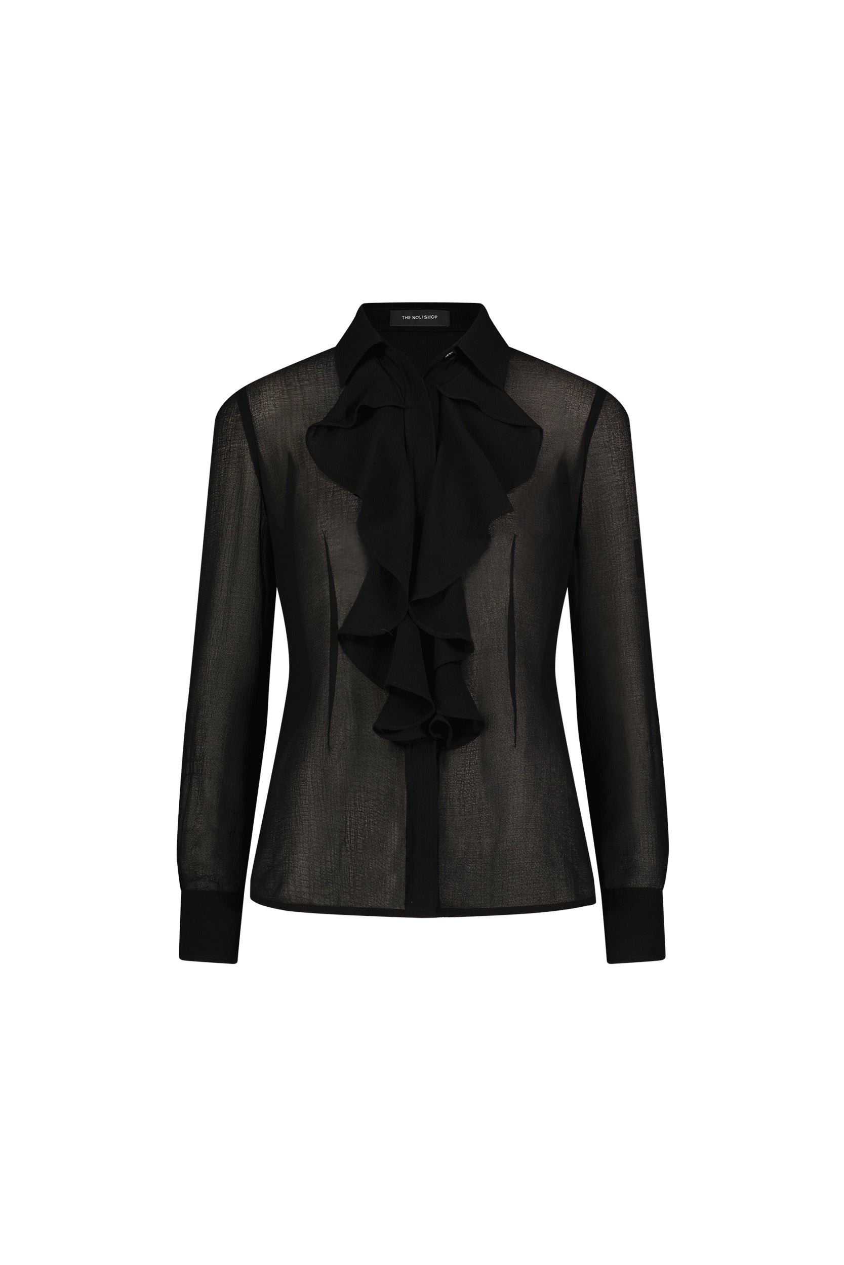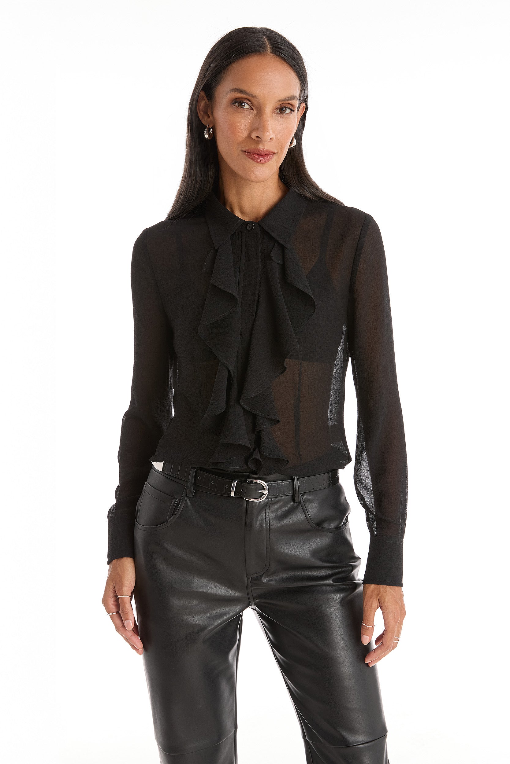 Romantic femininity meets modern tailoring - the Georgia Blouse is the incredible statement piece you've been searching for. Designed with front ruffle details dancing across a relaxed button-down, this top features a front-darting detail for a slimming effect. Perfect for layering, this dazzling style is a must-have.