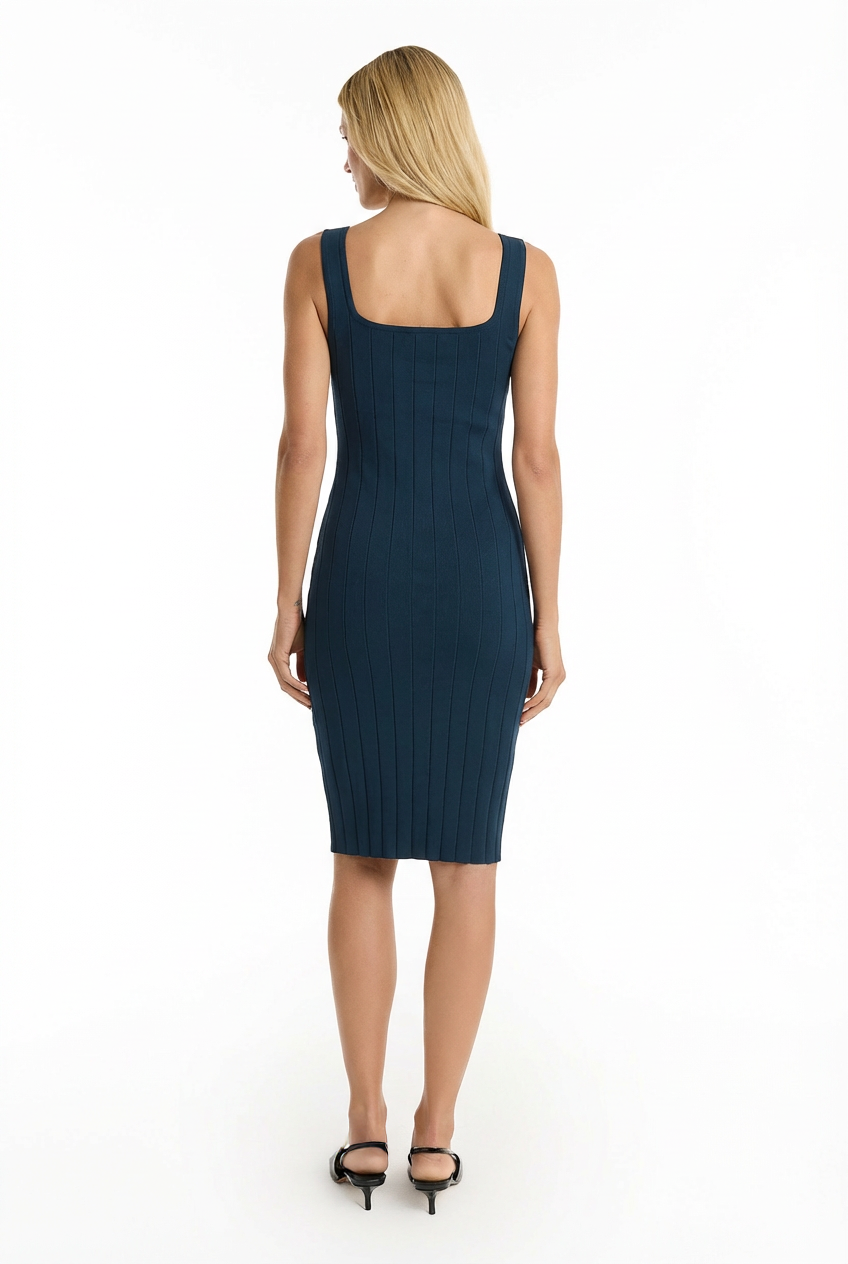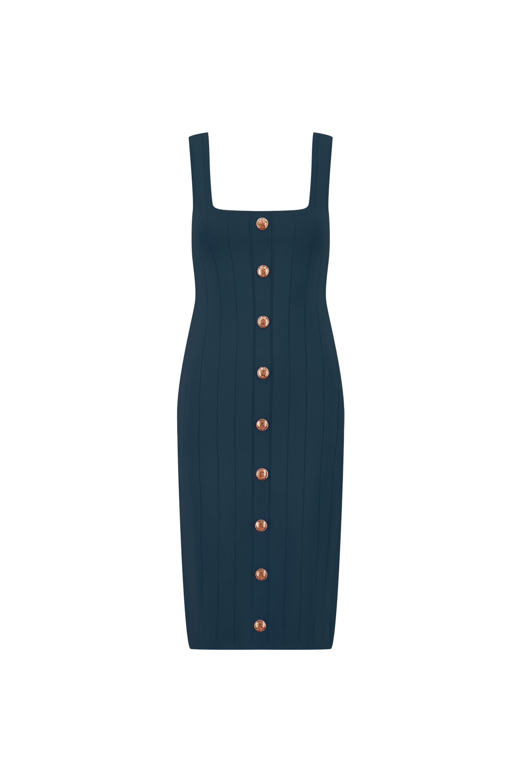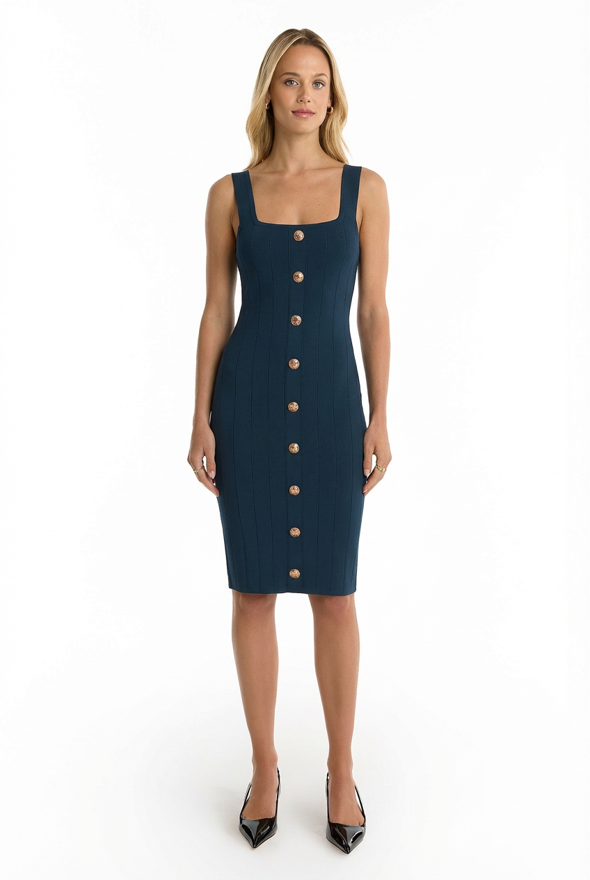 The Helena Button Dress in Ocean combines elegance with effortless style. Sculpted knit fabric features strategically placed lines that flatter your silhouette while the embossed gold dome buttons add a refined touch. Designed for warm-weather comfort, this dress transitions seamlessly from day to evening.