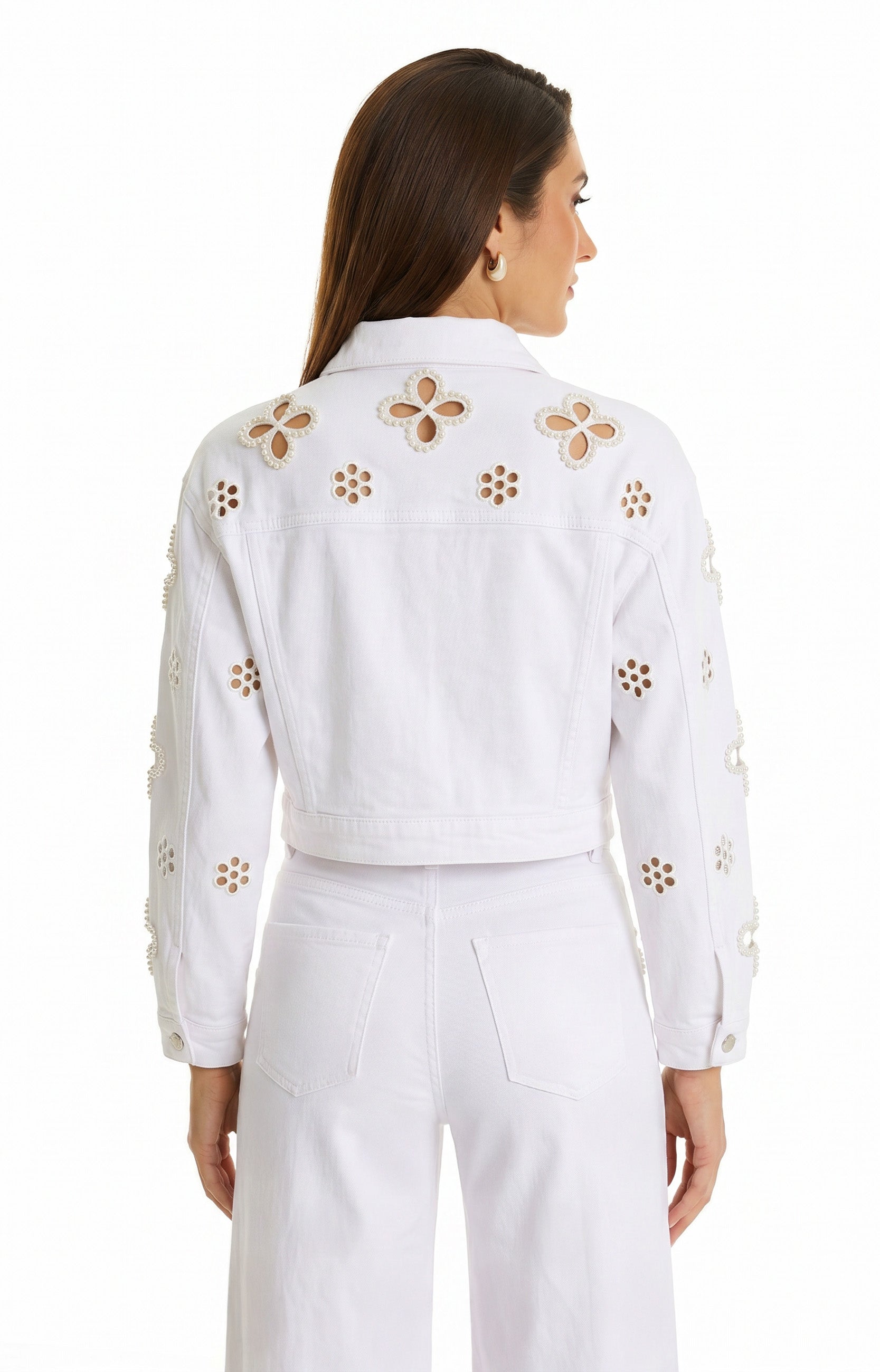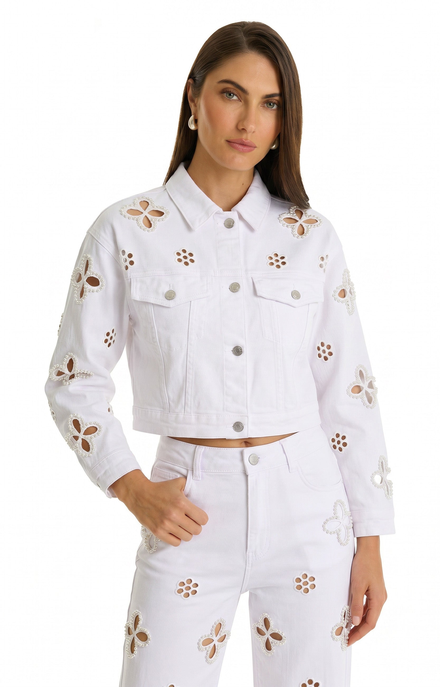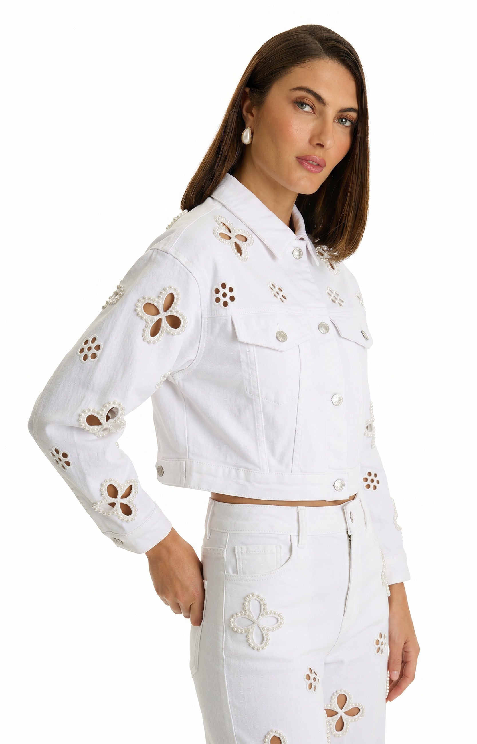 This is a white denim set that is delicate and dressy. The pearls that adorn the cut-outs give this an elegant vibe. This is lovely dressed up with jewelry and heels.
