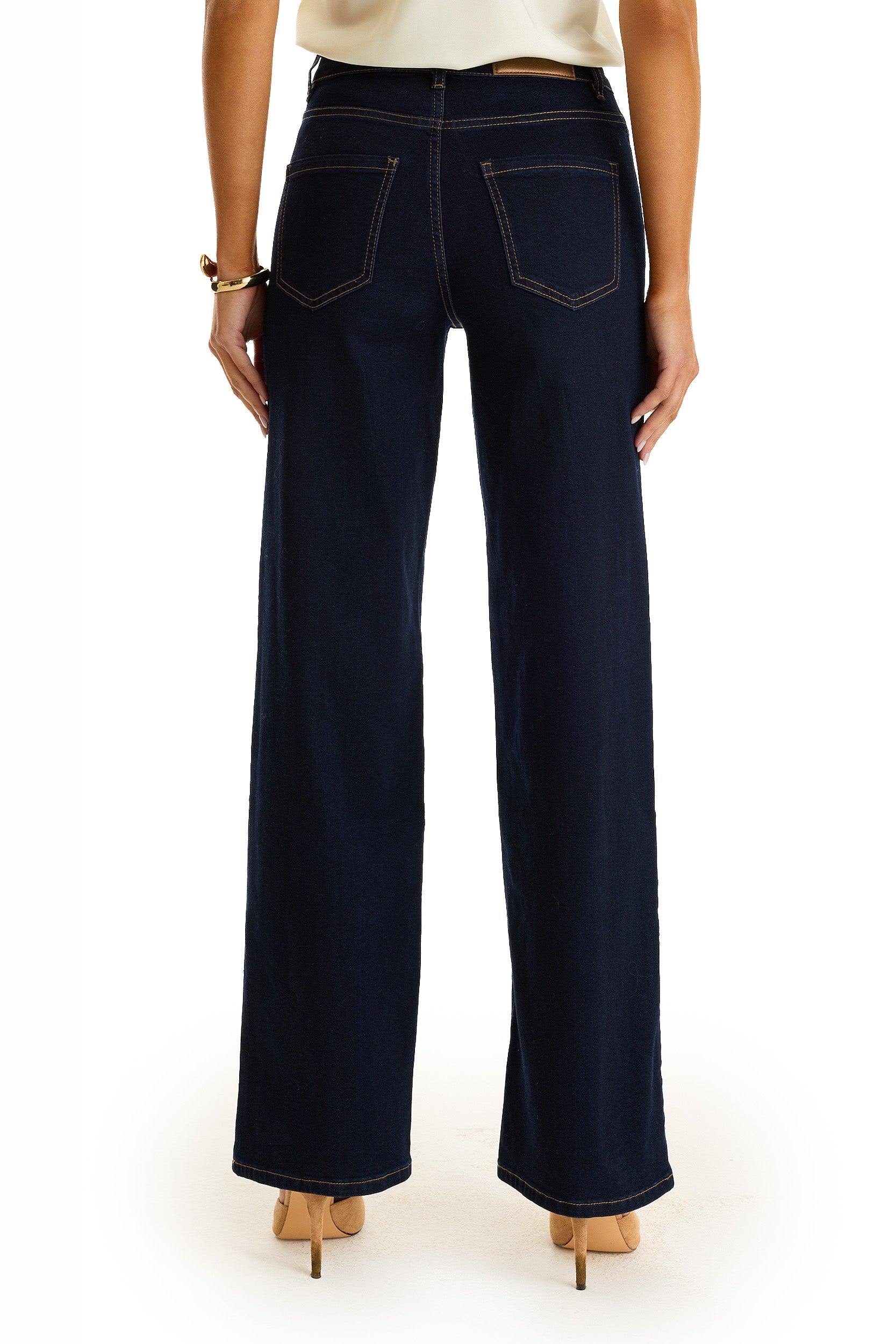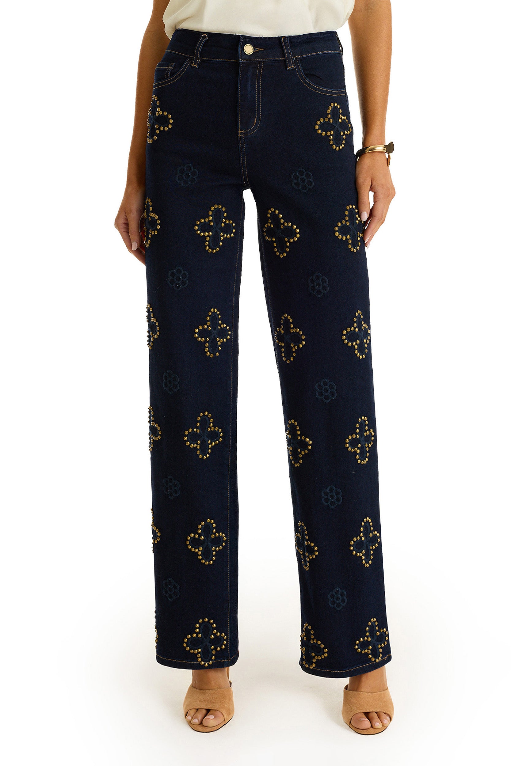 Meet the jean that’s redefining statement denim. The Kaia is crafted from ultra-soft stretch denim and finished with all-over floral stitching and gold studded jeans detailing, a perfect blend of softness, structure, and standout design. The high-rise, straight-leg silhouette flatters in all the right places, while the high rise studded jeans offer an effortlessly modern look.