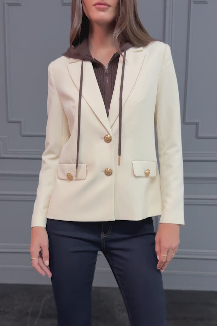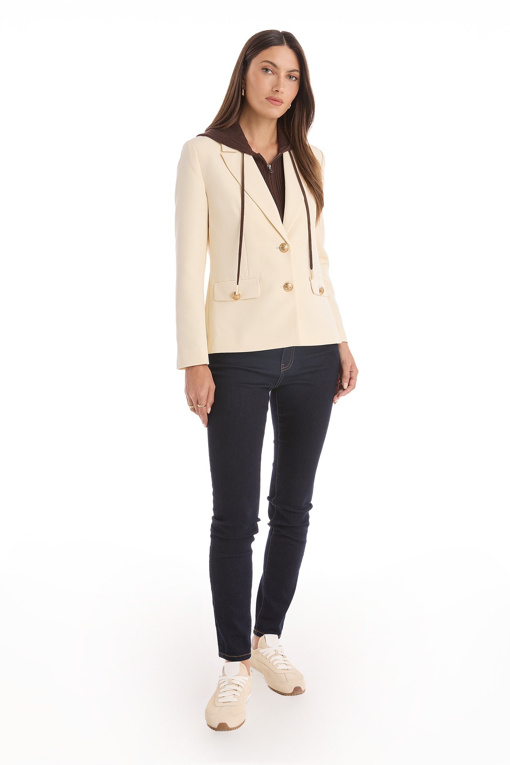 Elevate your wardrobe with the Kara Dickey Blazer. Crafted from transitional suiting fabric with a hint of stretch, it offers both comfort and a sleek silhouette. Decorative crest buttons add a touch of timeless elegance, making it an essential piece for any sophisticated ensemble. With the added detachable dickey knit insert, this style is perfect for any occasion.