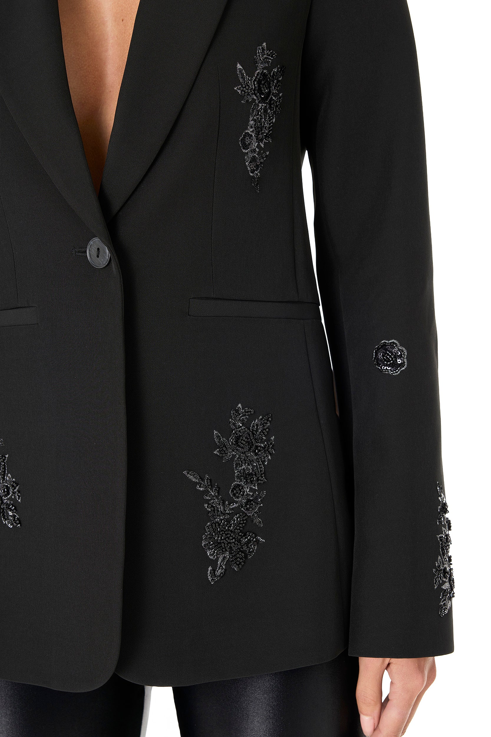 The London Floral Sequin Blazer combines a sleek slim-fit design with an elegant floral applique for a sensual and sophisticated look. Featuring a singular front button closure, this blazer offers a flattering and feminine silhouette, perfect for adding refined charm to your ensemble.