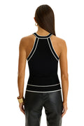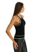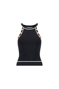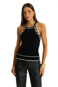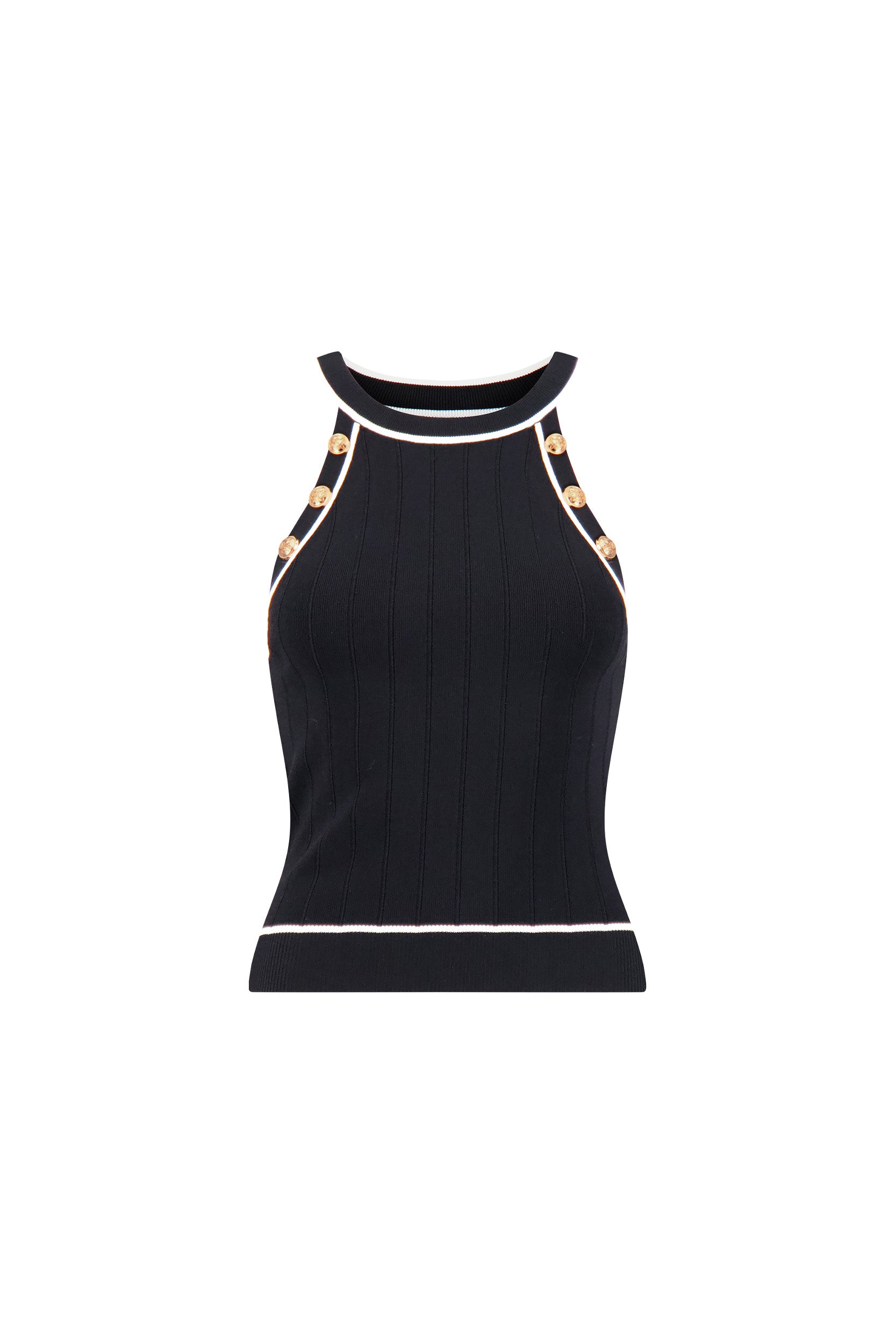 The Martha Button Halter Tank combines refined tailoring with luxe comfort. Crafted from a sculpted, soft knit fabric, it features an elegant halter neckline accented with decorative embossed gold dome buttons and white contrast trim. A timeless piece that elevates any wardrobe with sophistication.