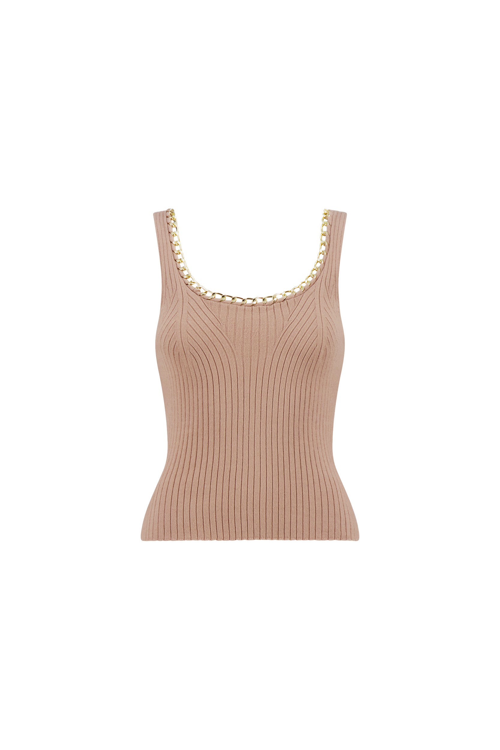 Elevate your essentials with the Millie Knit Tank in Mocha. This refined top features a luxuriously soft yet structured knit that frames the body perfectly. A delicate gold-toned chain is seamlessly integrated into the design, allowing for timeless sophistication with every wear.